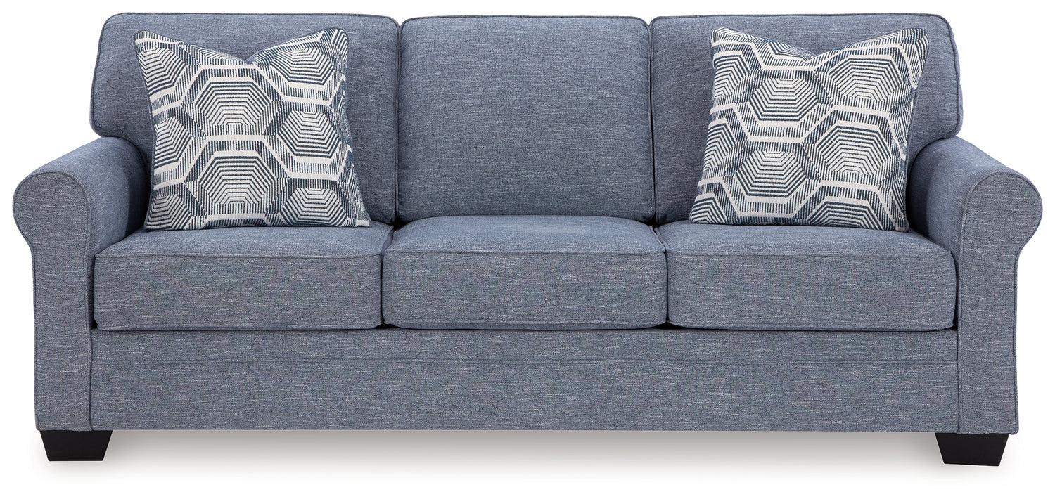 This sofa is defined by comfort, convenience and classic style. Soft to the touch and stain-resistant, the Next-Gen Nuvella™ fabric is easy to maintain. And you'll love the universal appeal of its denim-inspired hue. With roll arms adding a dash of traditional flair, the sofa is a simply chic approach to everyday relaxation.