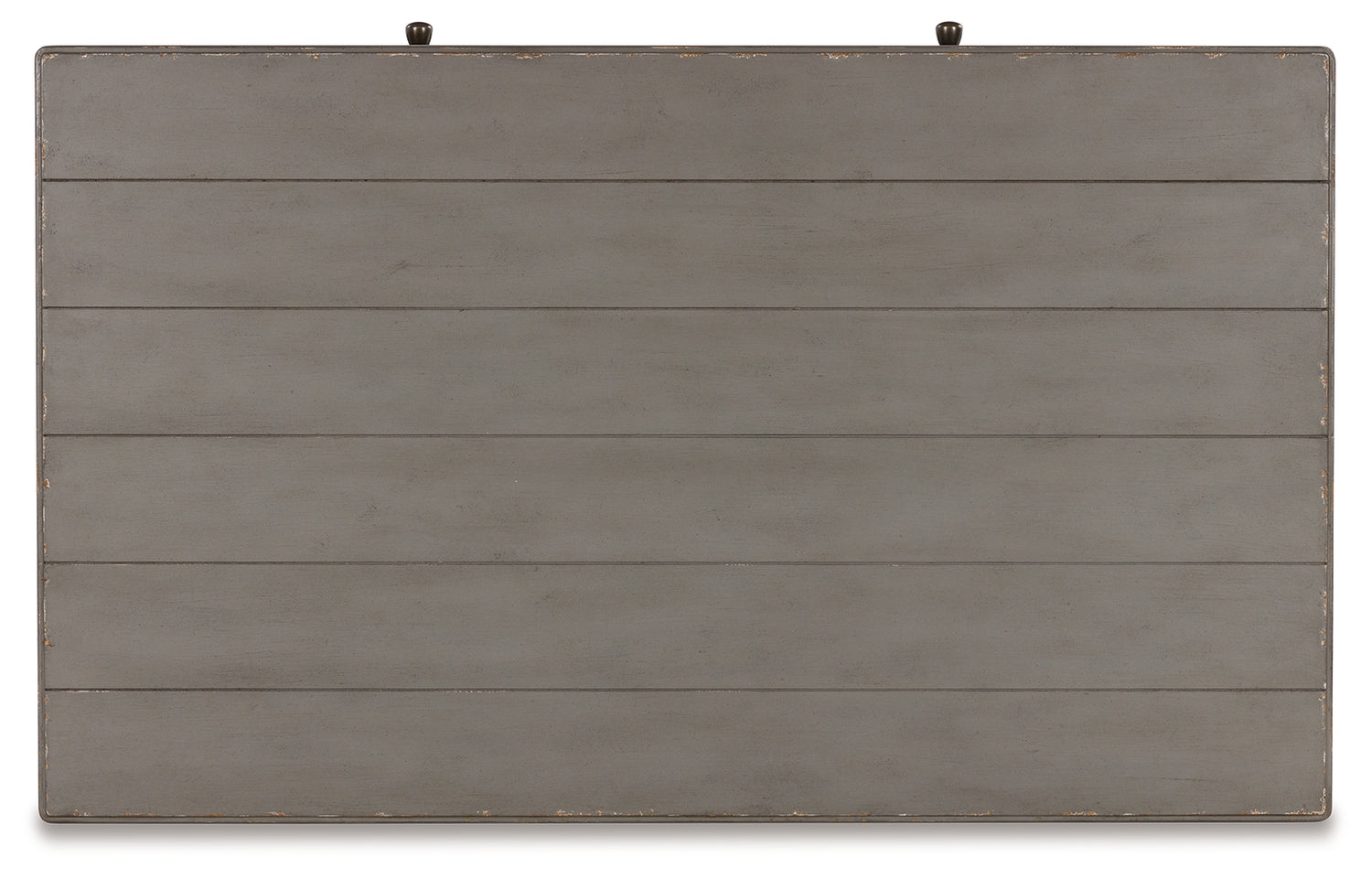 Put your love of European farmhouse styling on display. Finished with an antiqued gray chipped paint effect for an authentic vintage look, this coffee table is loaded with character. Two drawers and an open display shelf allow for storage and easy access to books, beverages and more.