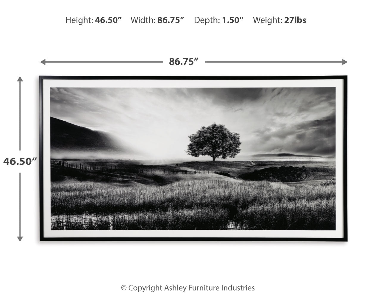 Filled with calming natural elements, this wall art has a refined look with a restful feel. It captures a landscape with rolling hills, drawing your eye to the tree standing tall in the center of the creation. Lighter tones in the clouds bring brightness to the black and white design, making for a striking addition to your modern decor.