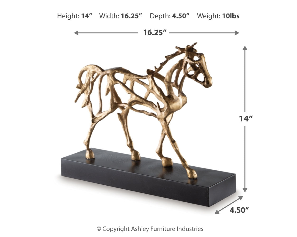 This magnificent equestrian sculpture is a stunning yet casual statement piece in step with your laid-back lifestyle. A cast iron figure in an antiqued goldtone stands atop a contrasting black metal base, making this sculpture a striking conversation starter on any shelf or tabletop.