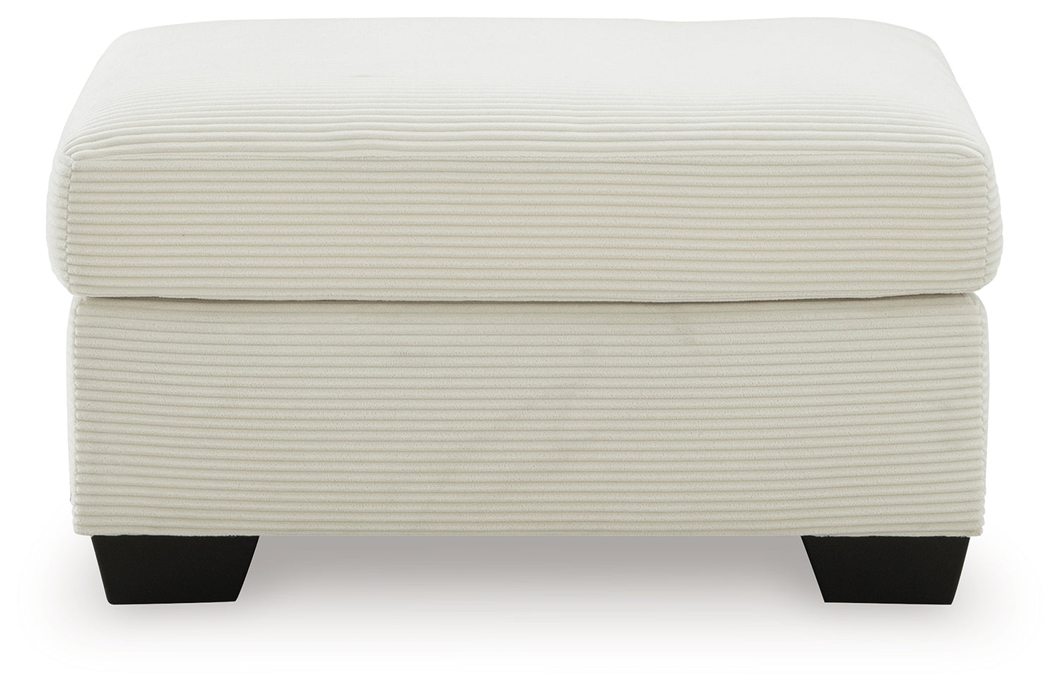 The crisp neutral hue and striking design details of this ottoman create a living room that expertly reflects your modern taste. For irresistibly cool textural appeal, the ultra-soft fabric is enhanced by a small-scale corded look. With a clean-lined silhouette, this ottoman allows you to take a trend-right approach to everyday living.