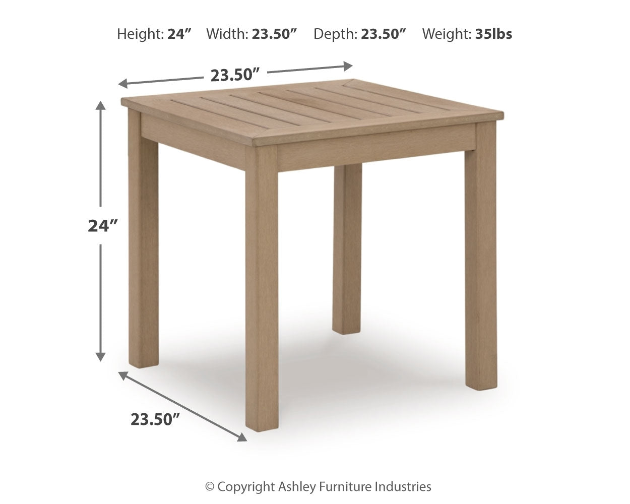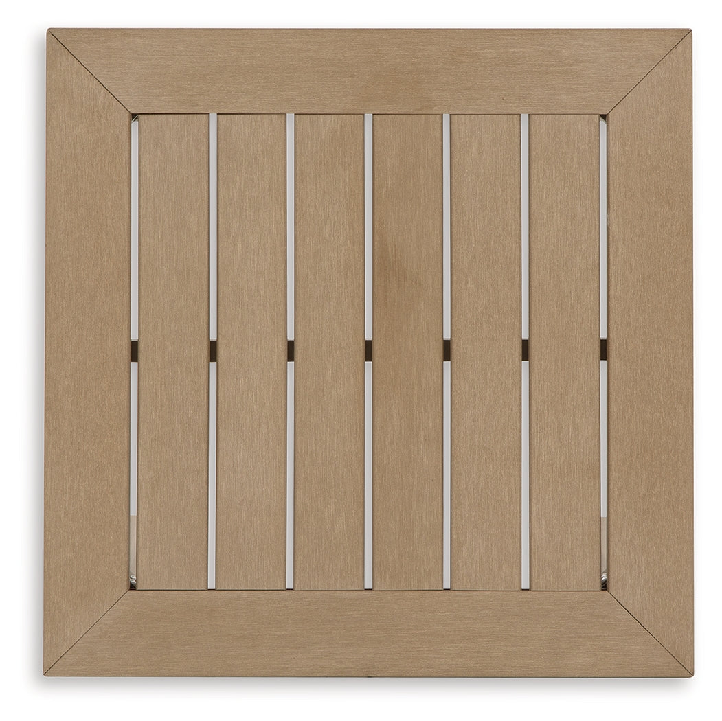 This end table is a beautiful addition to any outdoor living space. Effortless in its simplicity, this piece echoes your easygoing sensibilities. Combining durable, cutting-edge engineered materials, its Weatherwood construction in a blond wood color enhances the contemporary design. Pair this table with the matching sofa and chairs for a spectacular backyard or patio seating arrangement.