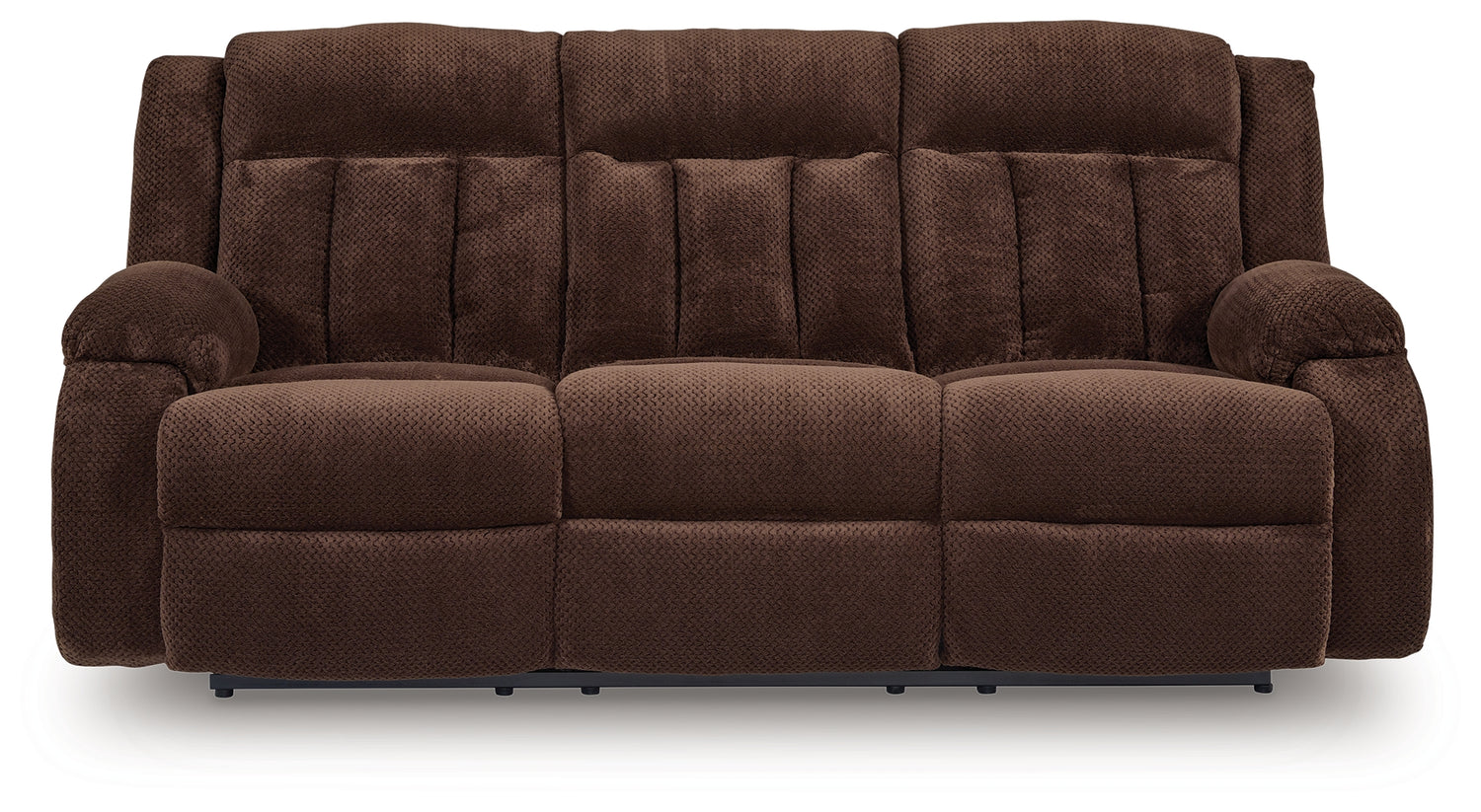 There's no need to sacrifice looks for comfort—this power reclining seating package serves up both, plus a richly relaxed sense of style. Its chocolate-hued velvet upholstery is ultra soft, with a plush waffle weave for an added layer of interest. The overstuffed pillow top armrests are custom made for lazy afternoon catnaps. And a one-touch power control takes the pleasure of reclining to a higher level.