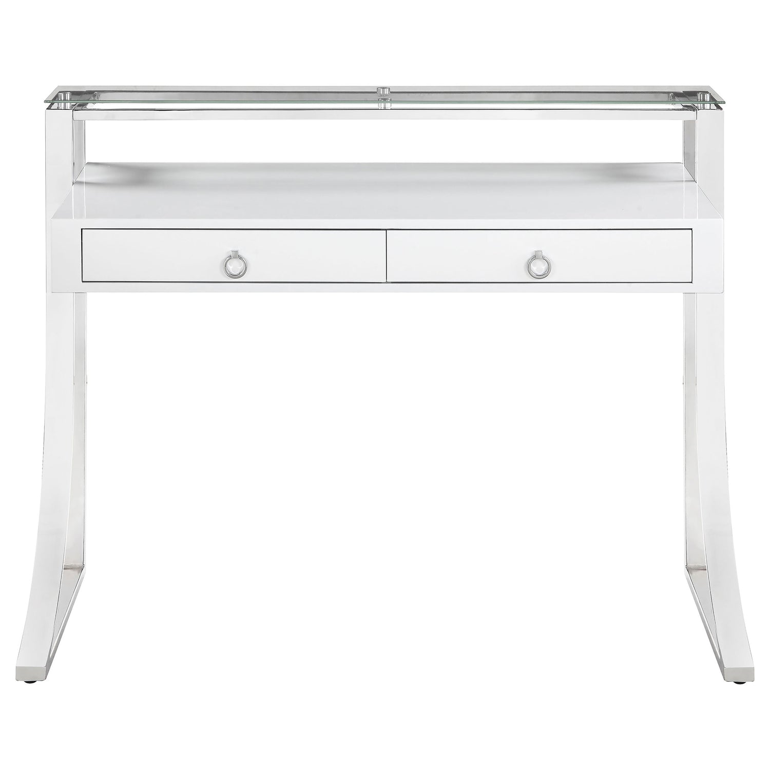 Add an edge of contemporary flair to any living space. This sleek, stylish writing desk exudes glamorous appeal. Its eye-catching frame is expertly crafted with a gracefully curved silhouette. Its gorgeous, glossy white surface blends appealingly with its shining chrome legs. Complete with two felt-lined drawers with full extension glides, this desk enhances any home office with convenience and modern style.