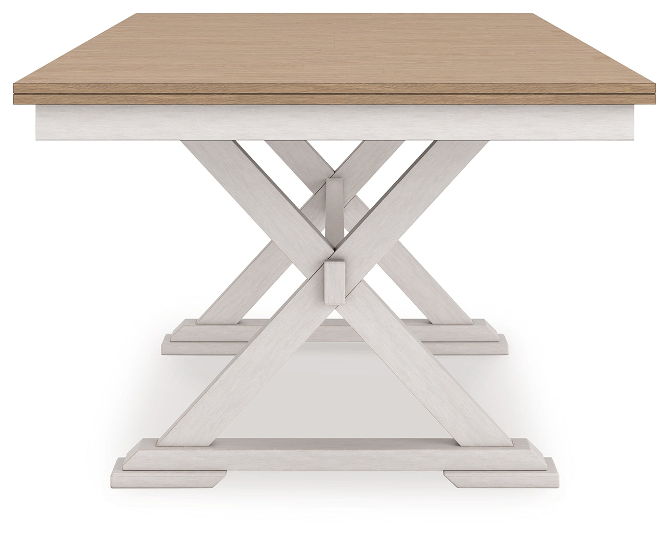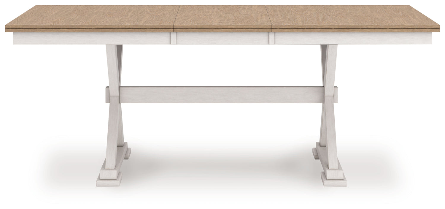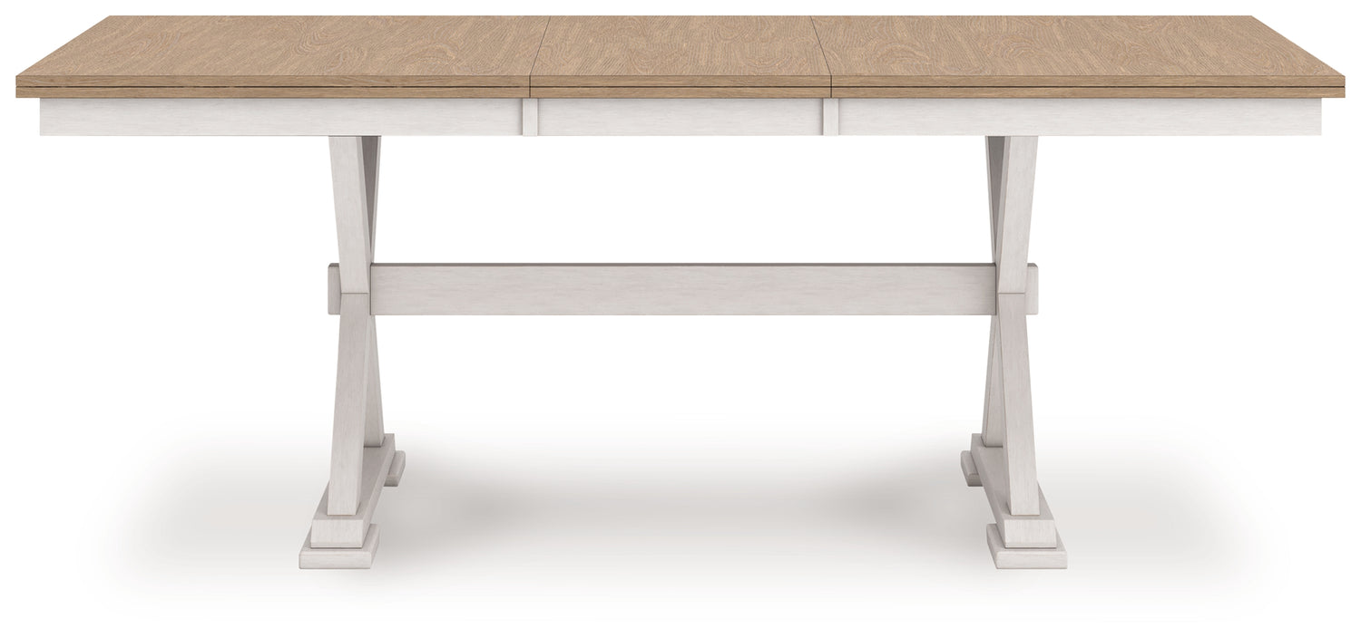 Busy breakfasts and family dinners get a dose of modern farmhouse flair with this dining package. Its two-tone finish contrasts a light butcher block hue with antiqued white for an utterly charming effect. An effortless dining solution, this set adds a touch of chic character to your space.