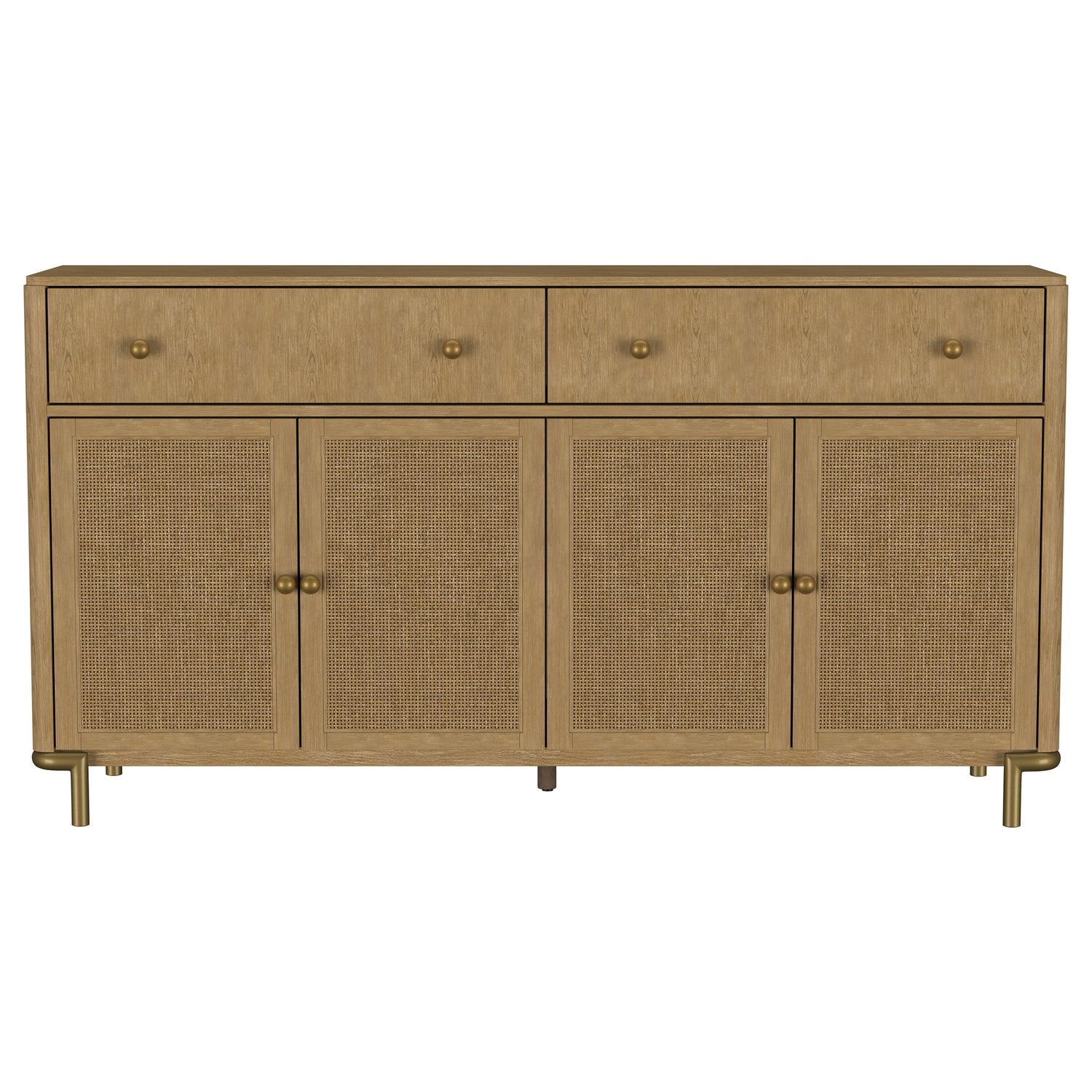 This 65-inch sideboard combines modern sophistication with organic charm and exceptional functionality. Featuring handcrafted woven cane door panels from Indonesia, it adds natural texture to any space. Constructed from solid Asian hardwood and white ash veneer, its refined craftsmanship is enhanced by a 17-step finishing process. Felt-lined drawers with English dovetail construction glide smoothly on 45mm metal ball-bearing tracks, while soft-close Euro-hinged doors and adjustable shelves offer practical storage. Antique brass knobs and legs complete the elegant design.