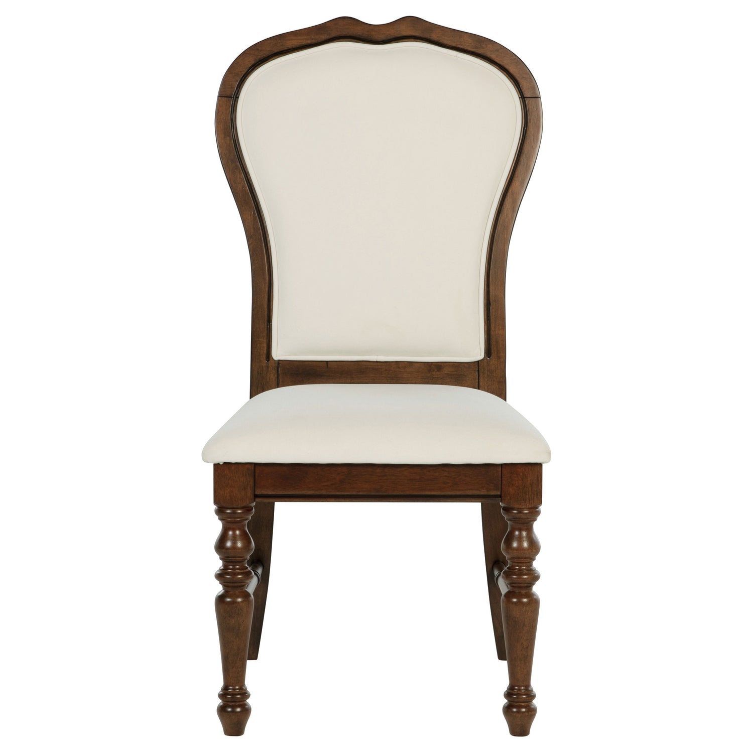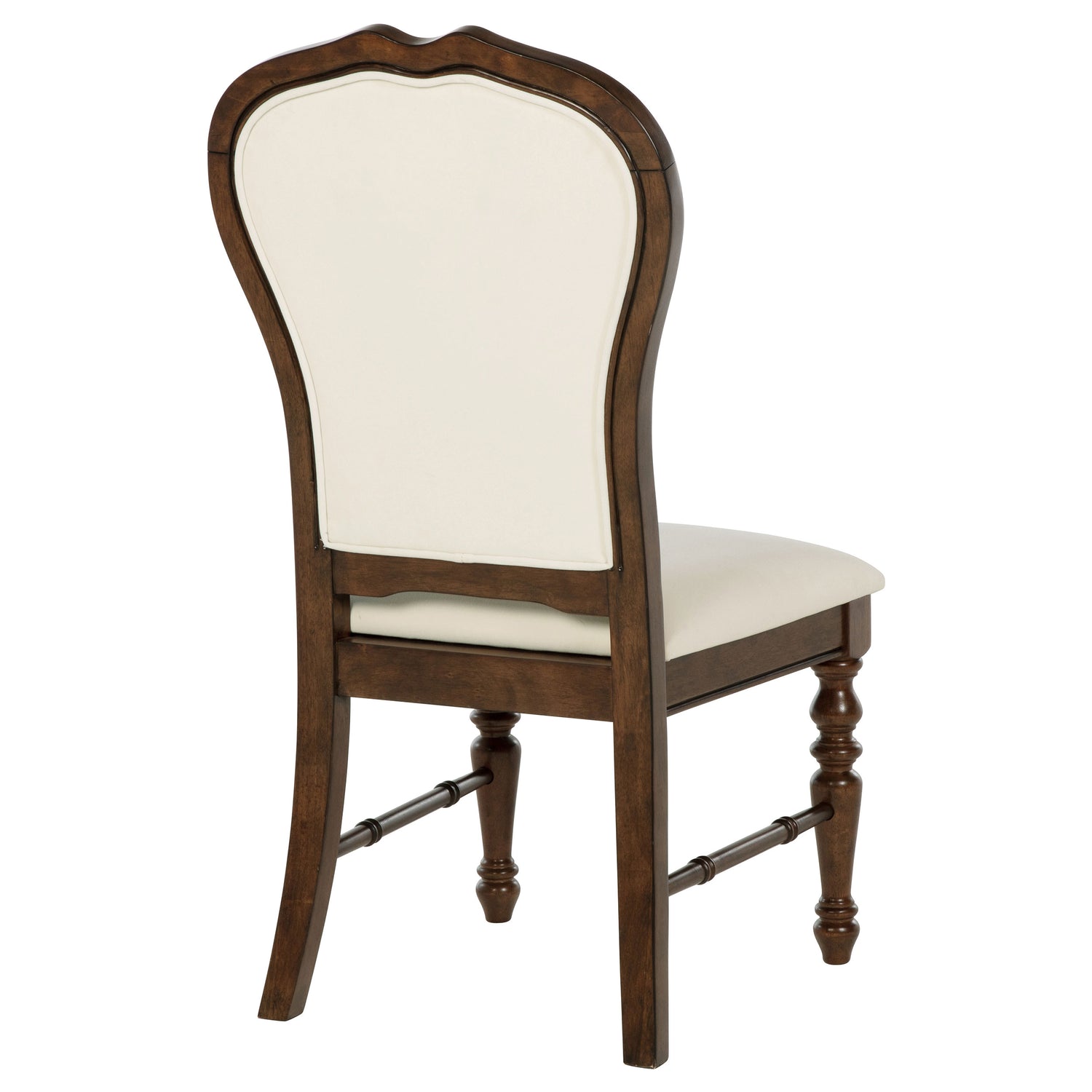 Complement your chic dining ensemble with a set of two traditional dining side chairs. Each boasts durable construction in Asian hardwood, complete with a rich brown finish. Chairs are designed with decorative rounded backs, framed in wood to create definition and character. Upholstery is paired with foam and features a crisp ivory color, creating contrast and depth against the rich wood grain. Legs are turned, with decorative stretchers that add detail and intricacy to your kitchen or dining room.