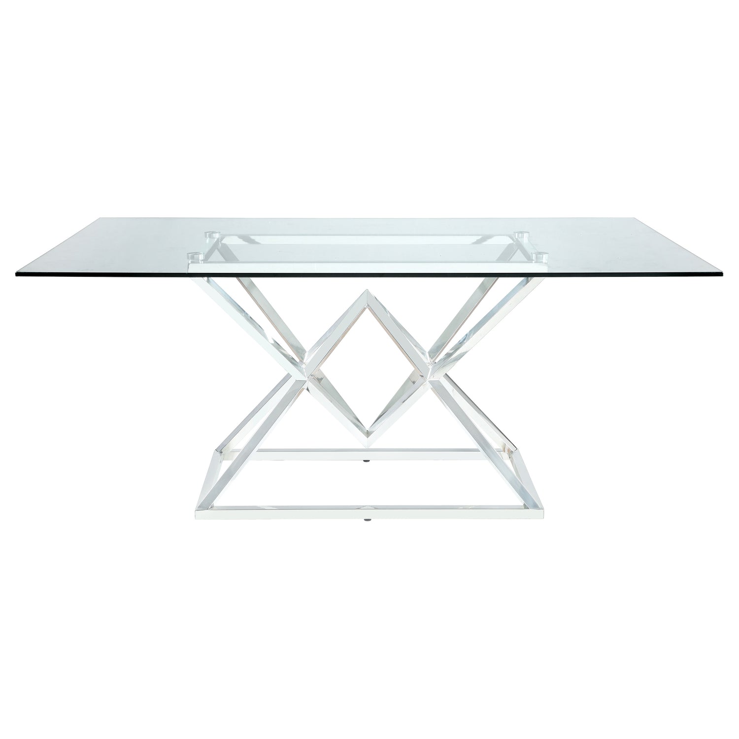 With an Art Deco flair, this six-piece dining set comes complete with a spacious table, four chairs, and a bench. The table features an angular, geometric base in a shiny chrome finish as well as a thick tempered glass tabletop with a softly beveled edge. Each of the four chairs offer a channel tufted, rolled back and the bench offers a padded, button tufted seat. These upholstered pieces are wrapped in a soft dark grey velvet with sleek flared legs that mimic the table base finish. This stunning table makes the perfect addition to a modern dining with a fun Hollywood glam vibe.