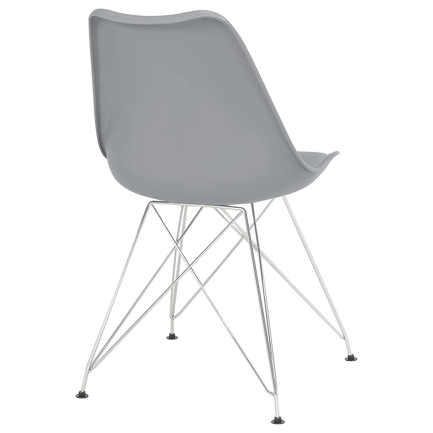 Designed with modern elegance in mind, this grey dining chair beautifully updates a contemporary home with its stylish silhouette and sleek materials. The seat and back are covered in smooth leatherette upholstery, adding a subtle textural appeal that pairs perfectly with the lightly cushioned seat for optimal comfort. The chrome-finished, metal base forms bold, angular designs, creating an eye-catching look that brings a fresh, modern vibe to any dining space. Perfect for casual meals or formal gatherings, this chair effortlessly enhances your dining room decor. Let this sophisticated piece breathe new life into your home with its chic and functional design.