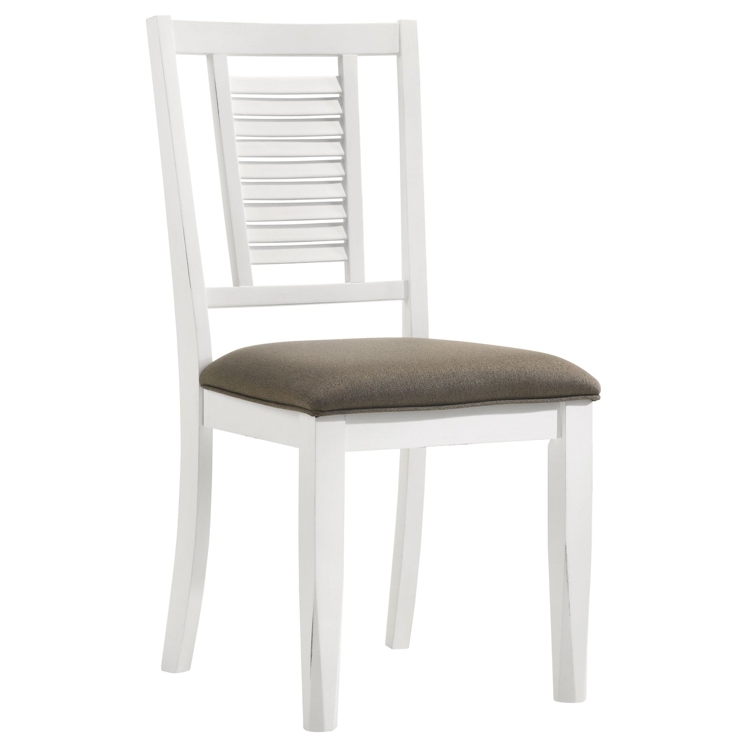 Gather around this modern farmhouse dining set, where each meal becomes a cherished moment under the warmth of the brushed brown table top. As the centerpiece of your eat-in kitchen, it exudes casual elegance with its classic rectangular table and the artful contrast of its white tapering legs. The coordinated chairs echo this design, their louvered panel backs and plush, dark brown seats inviting you to linger over your morning coffee or a leisurely dinner. Together, they craft a dining space that feels both open and intimate, where the clean lines meet cozy comfort, perfect for creating memories with loved ones.