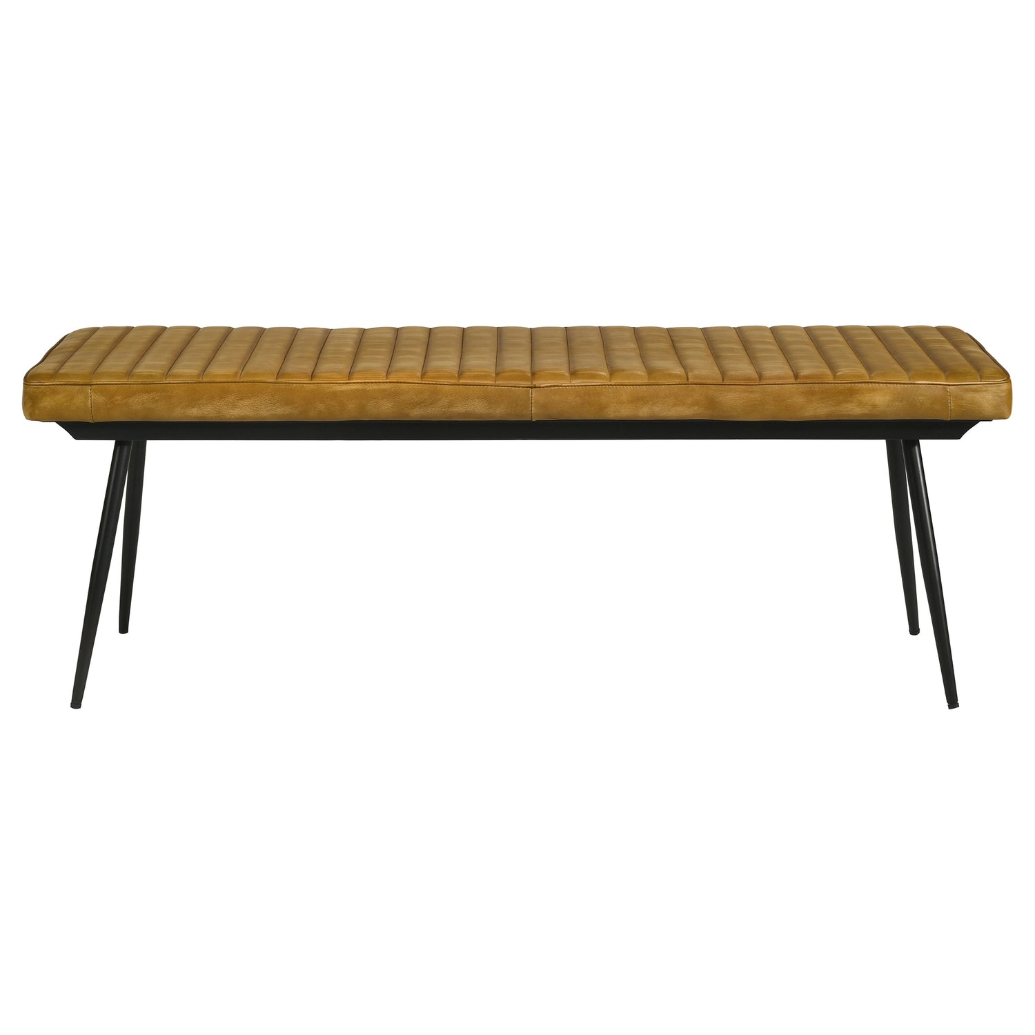 Retro charm is on full display in a dining ensemble that recreates a popular past era. Warm tones and a festive look indulge Mid-Century Modern attitude in this five-piece casual dining set. A rectangular wood and iron dining table anchors this stylish set, embellished with tilted open leg braces. Side chairs and bench feature iconic retro-inspired metal framing with slender, rounded legs that splay to create perfect proportion. This set includes a rectangular dining table, four side chairs and bench with channeled tufting upholstered.