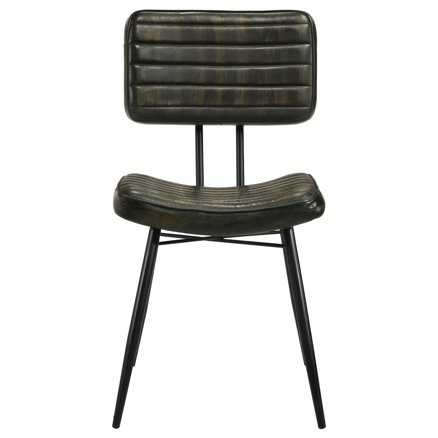 Retro charm with Mid-Century Modern attitude in a seven-piece casual dining set featuring a rectangular wood and iron dining table with tilted open leg braces and six side chairs with iconic metal framing and channeled tufting upholstery