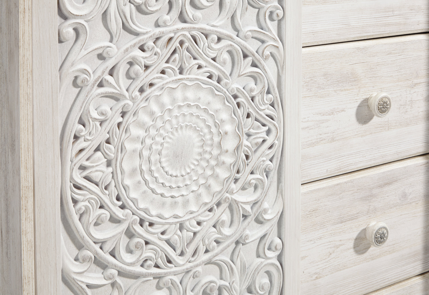 Showcase your trend-setting spirit with this bed. Inspired by bohemian tapestries, exquisite carved medallion pattern is a testament to boho-chic style. Whitewash finish sets a foundation for a room bursting with personality. Chest and nightstand included.