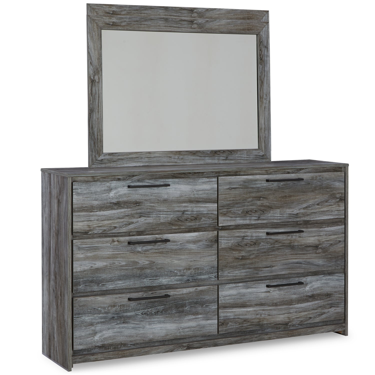 Rest and reflect in the beachy style of this bedroom package. Its driftwood and surfer-inspired smoky finish gives this set a rustic look that's perfect for setting the scene of an island getaway. The dresser's six roomy drawers give you the space needed for stowing away clothes and more. Clean lines, modern handles and a wide mirror combine for an authentic look to be enjoyed for years to come.