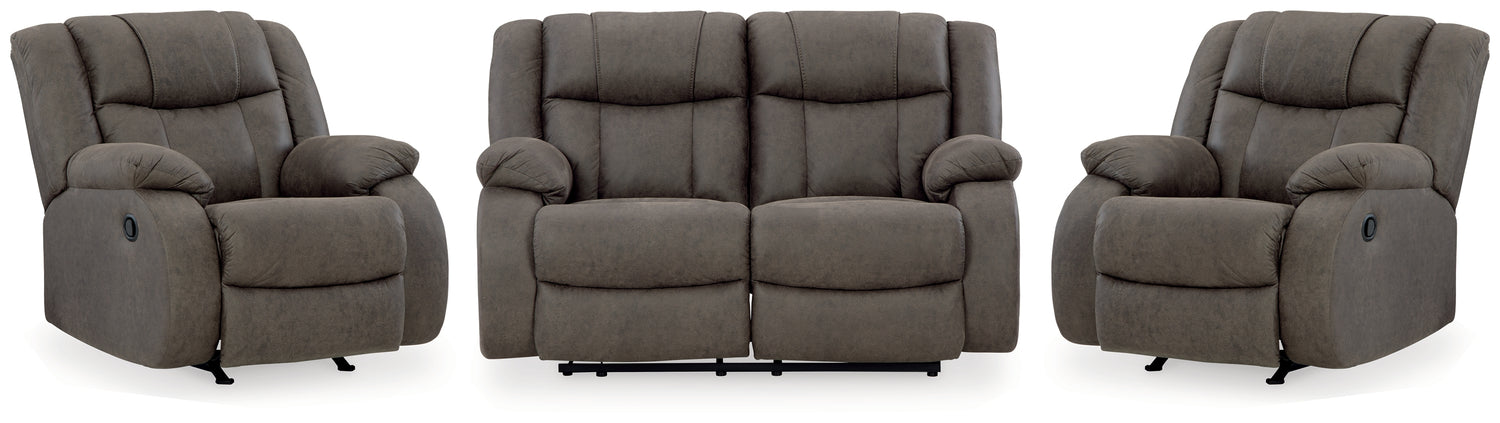 This loveseat tees you up to catch up on streaming or enjoy the latest game without breaking the bank. Its easy reclining motion and inviting stitched details craft a stylish seat that keeps you utterly at ease. And with a versatile neutral faux leather, this loveseat knocks contemporary comfort out of the park. 2 matching recliners also included.