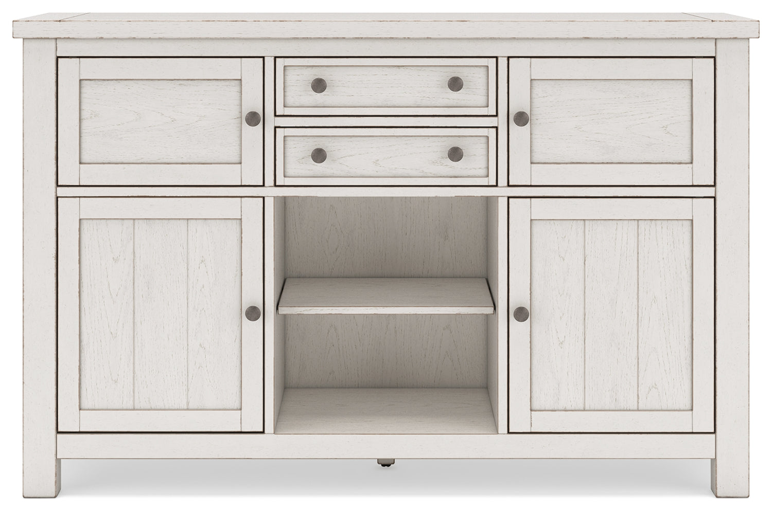 This dining package is sure to impress come mealtime. With its antiqued white finish and a planked effect tabletop, farmhouse-style dining has never been so fashionable. All that’s missing is you and your family.