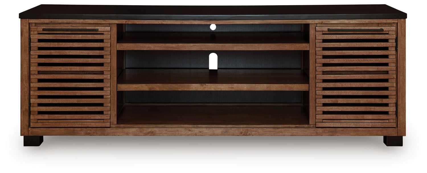 Double down on casual chic with the two-tone look of this TV stand. Its warm brown and matte black finishes reflect your eye for modern design. The trend-right slatted styling brings added charm. And with handy cabinets, shelving and cord management holes, keeping entertainment consoles and accessories organized is a breeze.