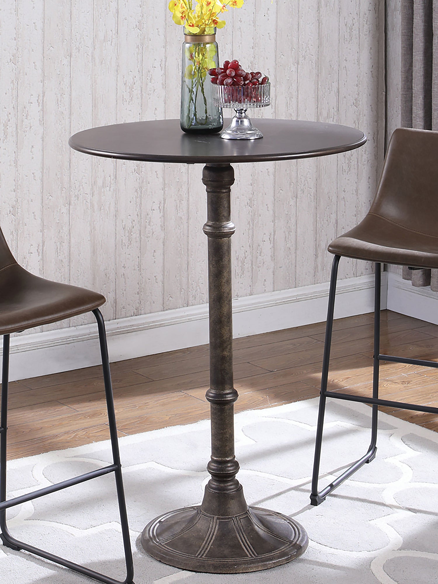Elevate your space with this elegant bar table, inspired by classic Parisian bistro design. Featuring a rich, dark wood top and a gracefully sculpted metal pedestal, it blends vintage charm with modern function. The antique bronze finish brings a warm, refined touch, perfect for kitchens, home bars, or cozy nooks. Built with sturdy engineered wood and heavy-gauge metal, it's as reliable as it is stylish.