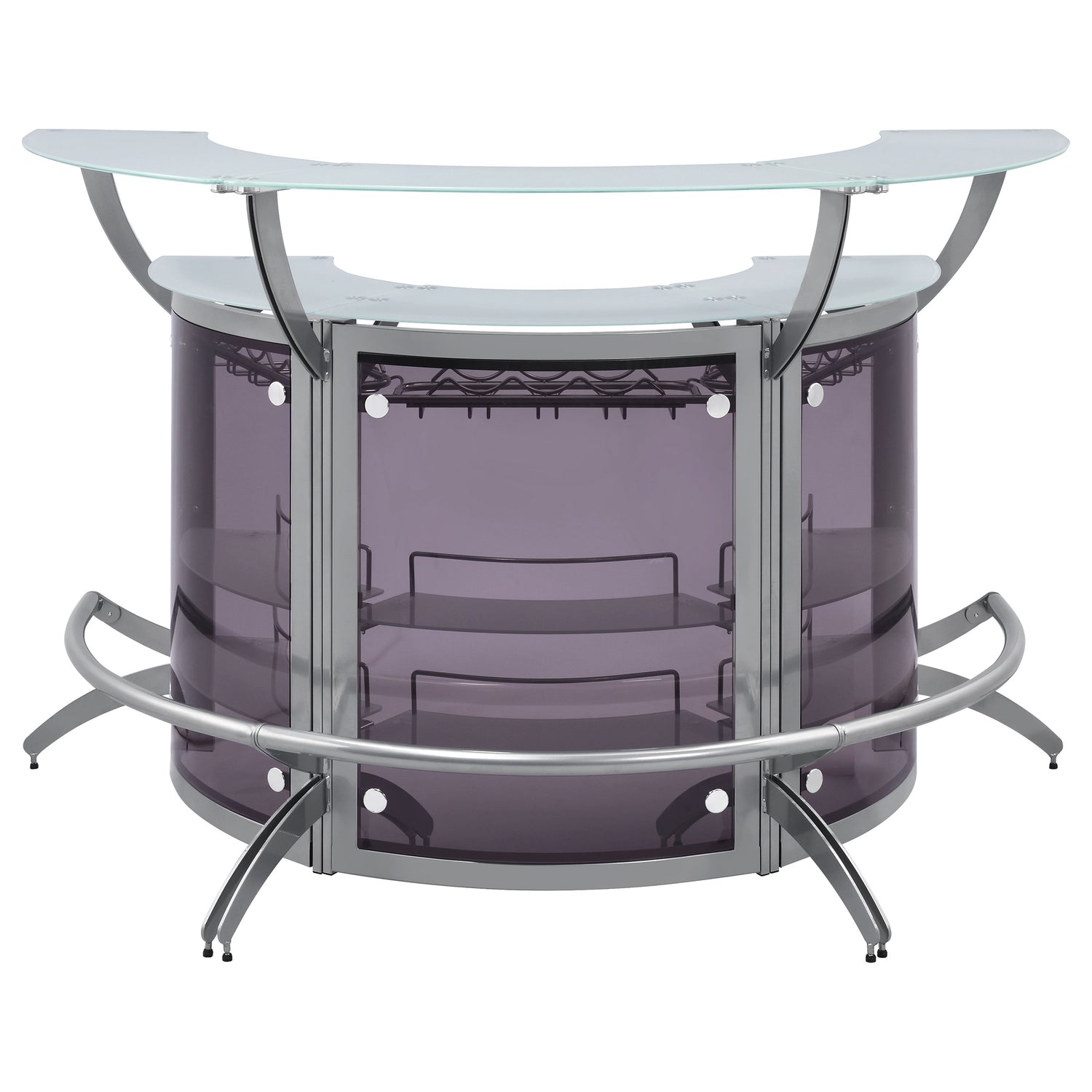 Perfect for the modern entertainer, this three-piece bar set adds visual intrigue and function. Constructed of metal, this bar unit set features a stunning champagne finish and smoked acrylic panels. Connect the three units together for a multi-dimensional bar experience. Display your favorite libations and stow away glassware for easy reach. The frosted tempered glass top and built-in foot rail are perfect for guests, paired with bar stools or on its own.