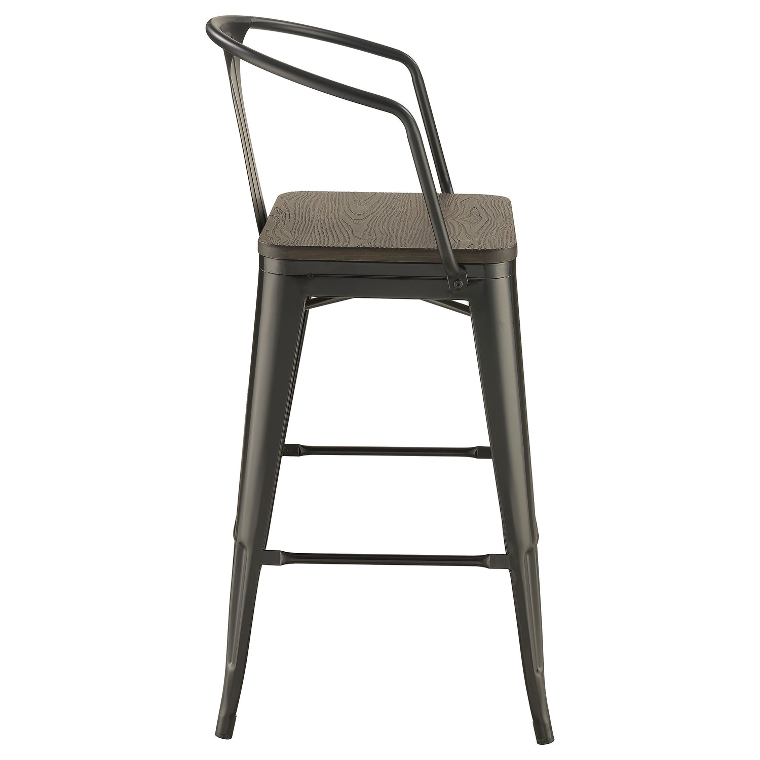 Add a touch of industrial flair to your bar or kitchen area with this Tolix style bar chair, featuring a blend of metal and wood-inspired textures. The chair boasts a sturdy metal frame with a sleek matte black finish, paired with an embossed solid bamboo seat in a dark elm finish. Its curved backrest and integrated armrests provide ergonomic support, allowing for relaxed seating during meals or gatherings. With its minimalist design and durable construction, this chair is perfect for both home and commercial settings. The combination of rustic wood tones and modern metal accents makes it a versatile addition to any decor, offering both comfort and style.