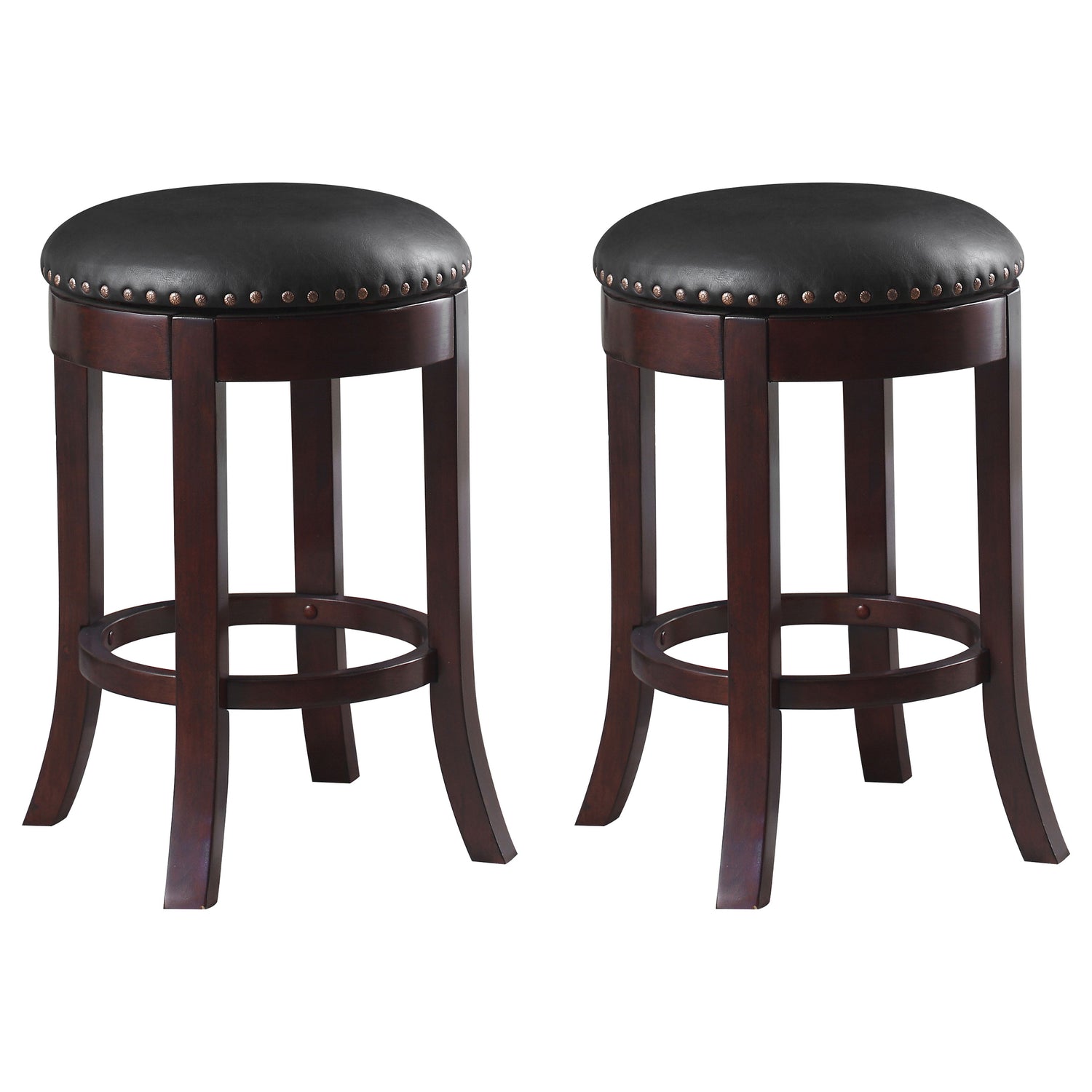Classy and chic, this backless bar stool adds an air of understated luxury anywhere you choose to entertain. Its four wooden legs have a slight curvature, elegantly flaring out from its sturdy seat. Its comfy, padded seat conveniently swivels and is upholstered in soft, brown leatherette. Decorative metal rivets give it a hint of classic glamour. With a 24-inch height, this stool can be easily tucked under a bar or counter to help you save space.