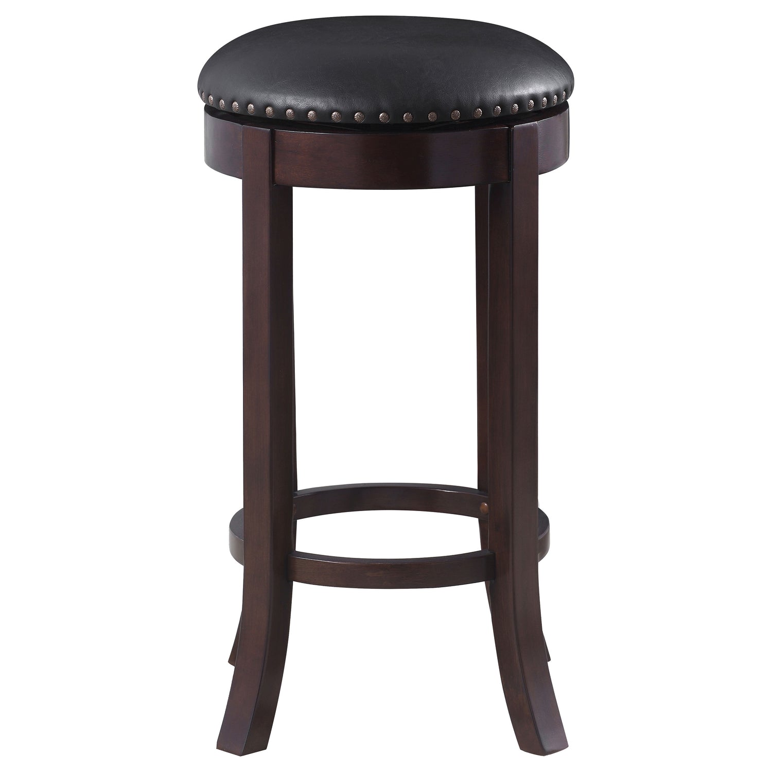 Transform your recreation room or wet bar into an appealing area for entertainment. Reminiscent of an old-fashioned pub, this barstool is tasteful and stylish. Smooth, dark brown upholstery pleasingly complements its leg finish of medium brown. Eye-catching metal rivets lend a pleasing touch of panache. With a comfortable foot rest and round swivel seat, this stool is an excellent option for adding comfort and glamour to your home.