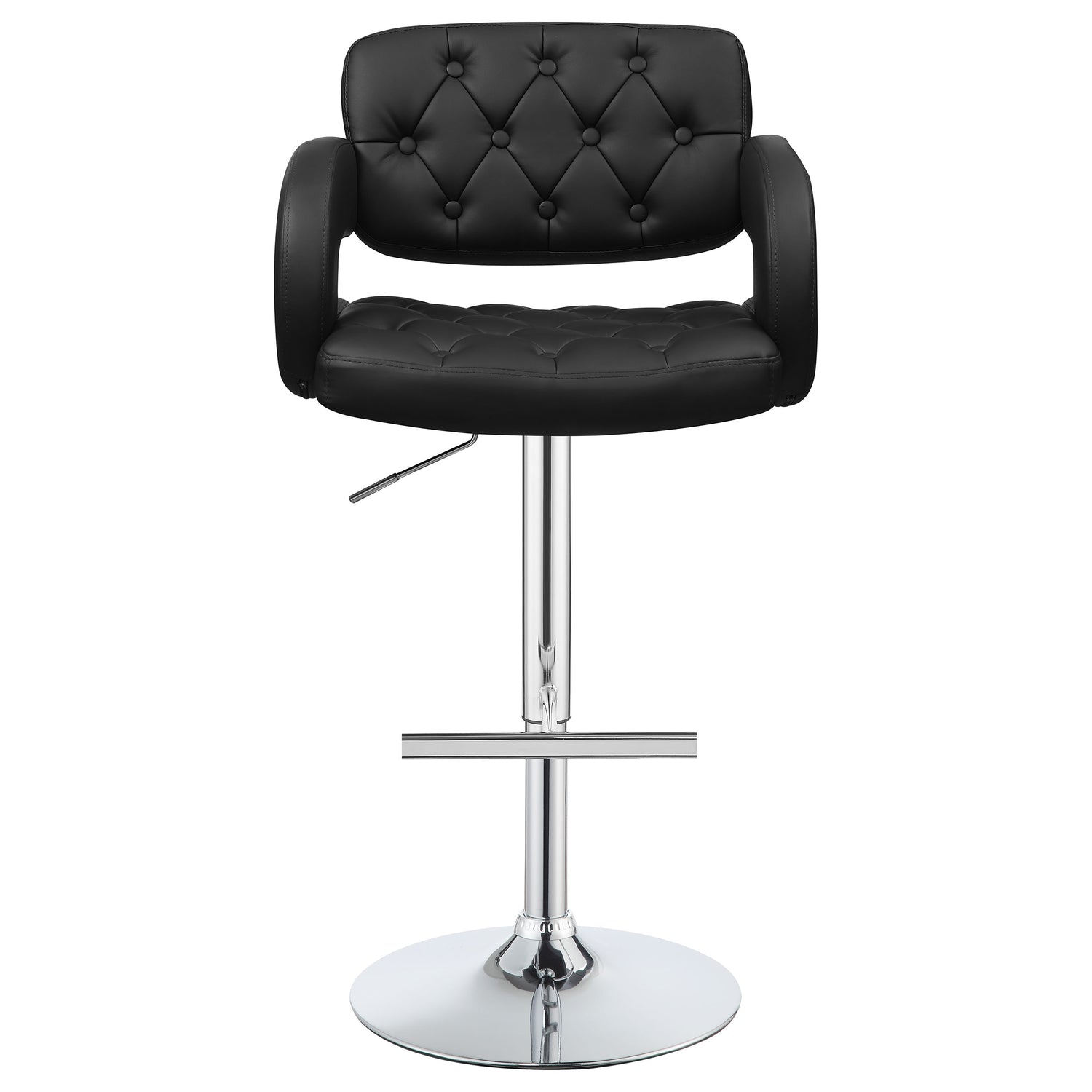 Expressive and interesting design elements team up to deliver a fun look. Make a modern or transitional space flush with style. This bar stool borrows from a retro theme with a hint of barbershop charm. An ergonomically positive seat, back, and arms encased in black upholstery match with virtually any palette. A bright, shiny chrome base with a bar footrest looks sleek and dynamic, and adjustable seat heights accommodate a bar table or counter.