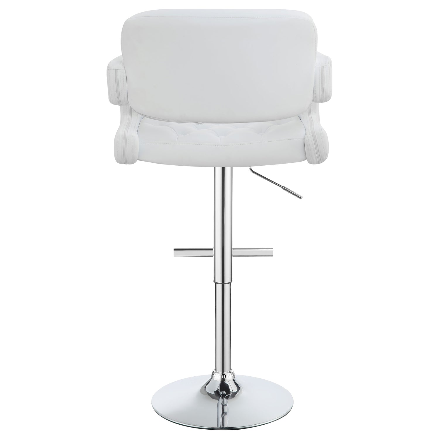 A rec room or home bar never had such chic bar seating. Chrome finish leg and base with shimmering white upholstery. Cushioned seat adjusts to maximize your presence, with chrome footrest to help maintain your perspective. Padded armrest allows you to lean comfortably in to make your point or sit back and nurse a martini. Trendy yet practical, bar stool is a modern enhancement to your home entertainment.