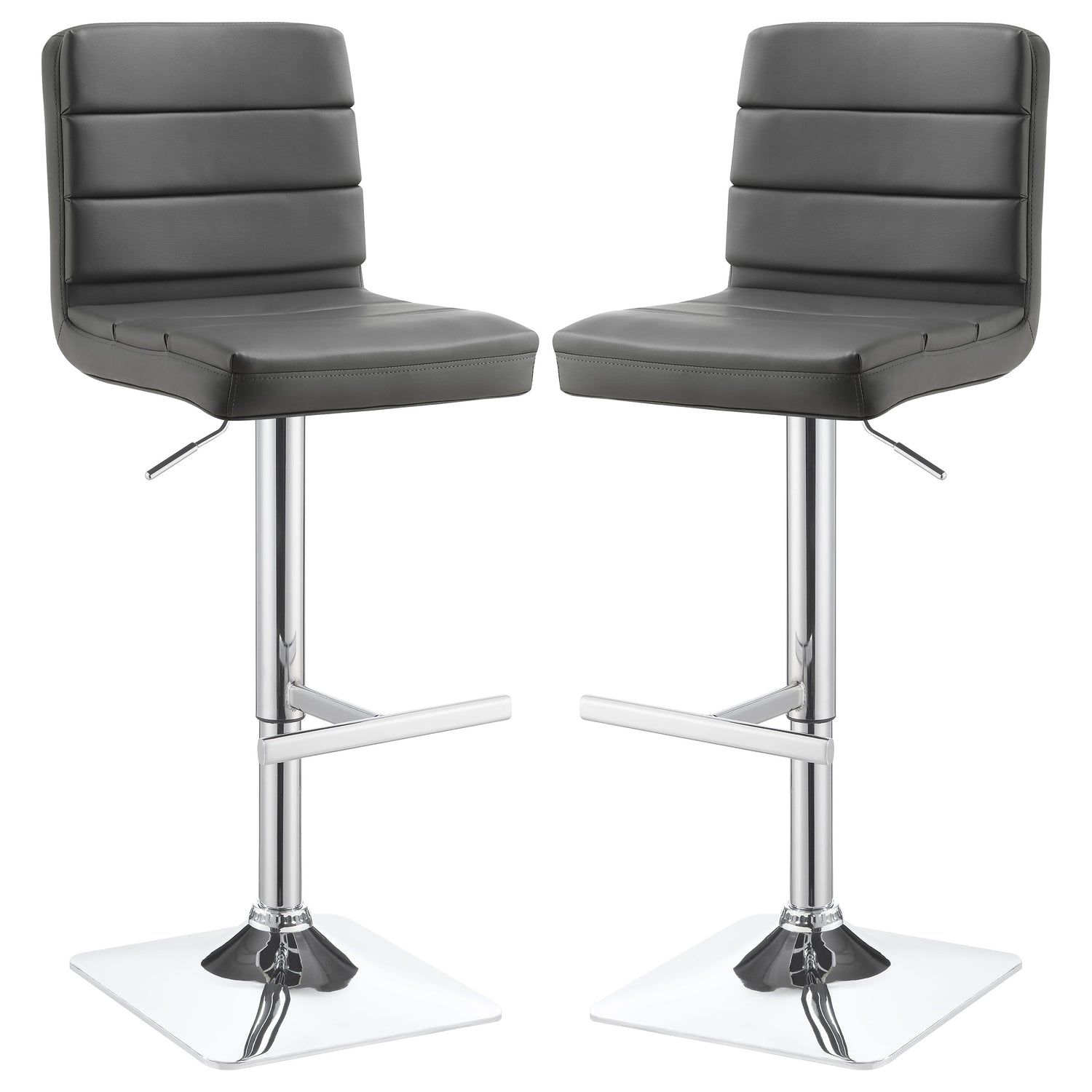 Chic grey leatherette cements the contemporary credentials of this adjustable barstool. Ideal for a home lounge or remodeled kitchen island, the stool features plush cushioning and a full back for ample support and comfort. A pedestal base boasts a square foot and built-in footrest. A chrome finish gleams and delivers a sleek, refined look. With a height adjustable seat, this stool complements modern bar tables and counters.