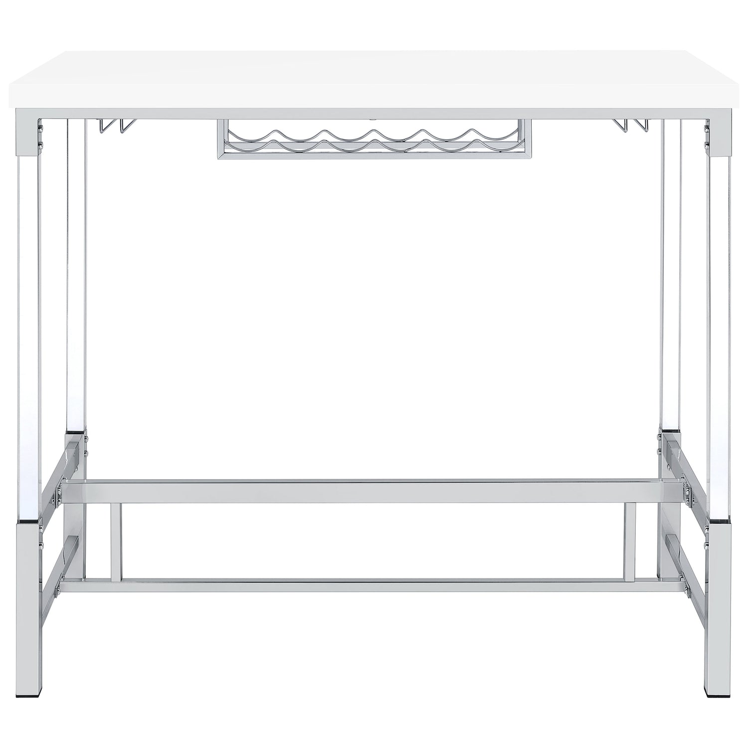 Create the ideal spot to share a bottle of wine with friends with a contemporary bar table. Perfect for two to four, it boasts a crisp, streamlined silhouette with an elevated tabletop in a bright white finish. The base features a silver finish and trestle details. Acrylic legs add a sense of light, airy ambiance, perfect for a compact nook or dining room. The table includes a built-in six-bottle wine rack and two stemware racks that make pouring a glass of your favorite vintage simple and easy.