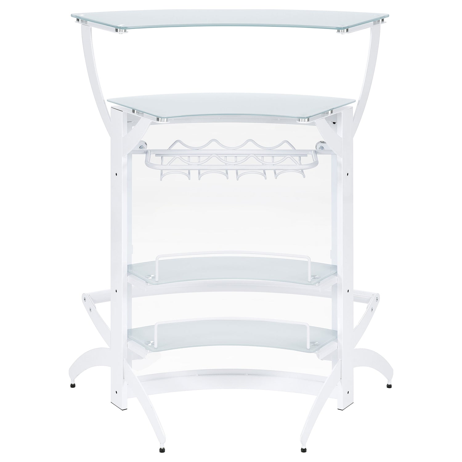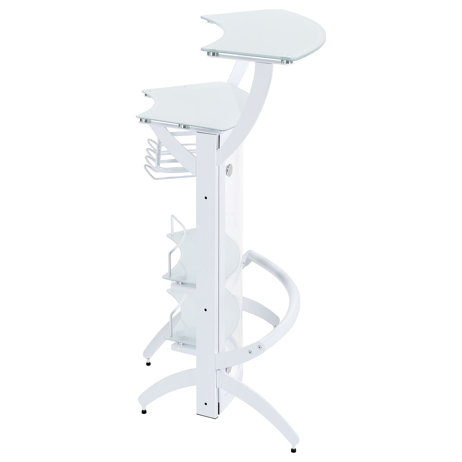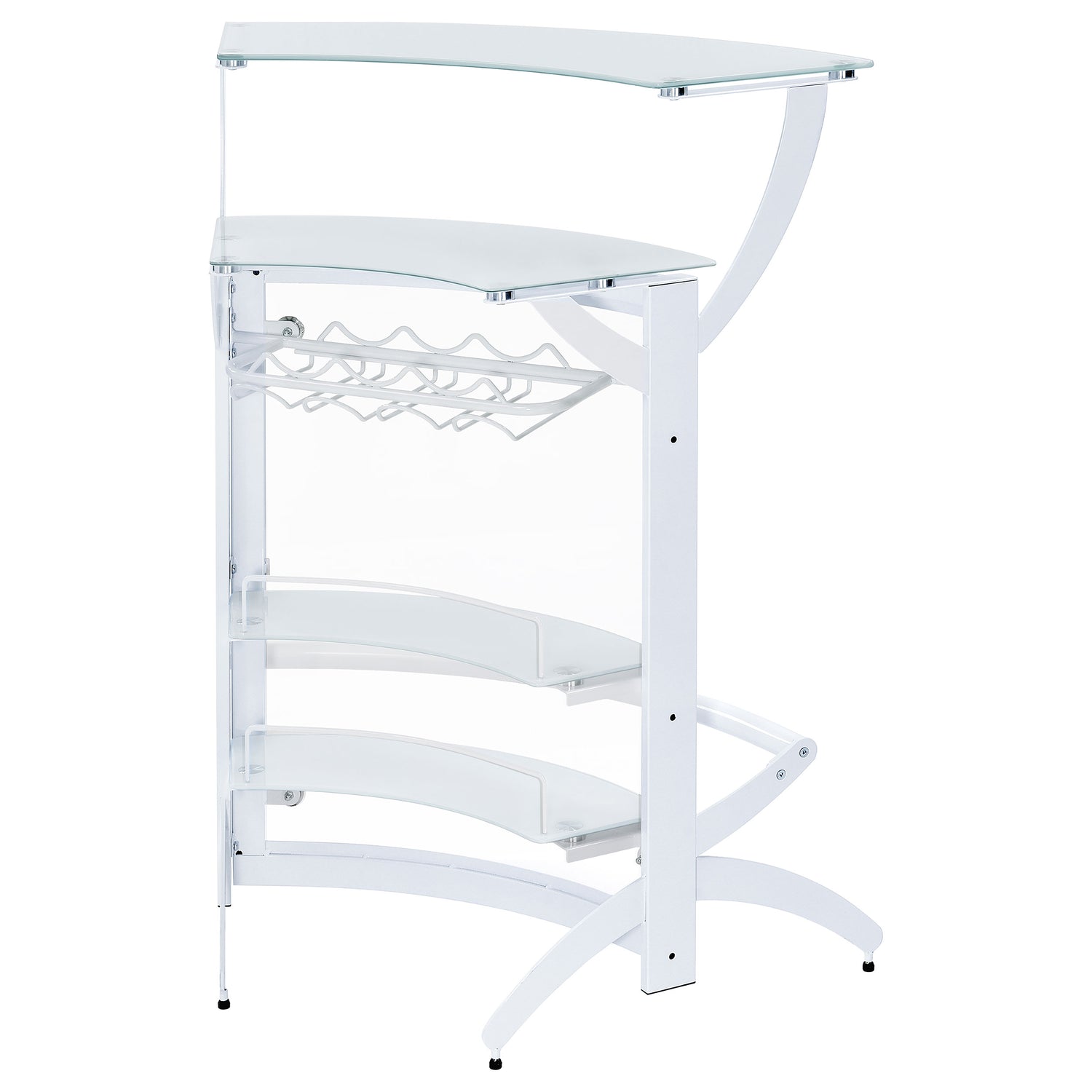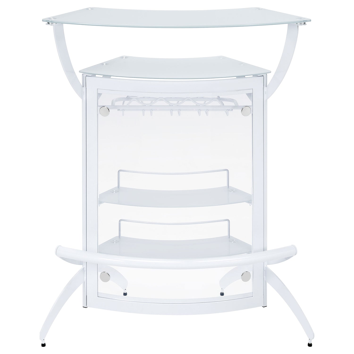 A sleek curved silhouette delivers a functional and aesthetic boost to this home bar unit, a great choice for fulfilling your casual entertainment needs. A modular motif fits the most custom contemporary design schemes, making it simple to host guests or family. White acrylic and glass construction stands out in any setting. A spacious exterior upper shelf is perfect for drink or snack prep, as a rack housed behind a glass door makes room for stemware and interior shelves store more bottles. Dressed up with mirror case trim and a mirrored case top shelf, it creates a glam influence with extra sparkle.