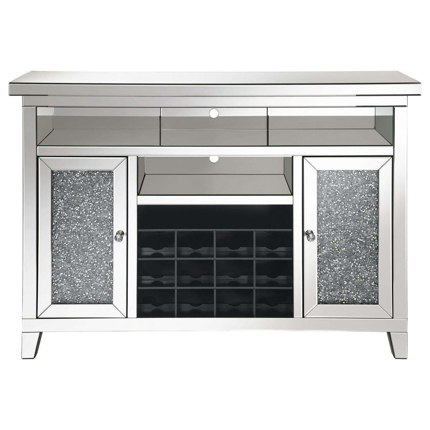 Create a breathtaking focal wall for your dining space with this stunning modern glam wine cabinet. Spacious and sparkling, this wonderful wine cabinet boasts glamorous elements like mirror tile and trim and a faux diamond inlay for a luxurious look and feel. Two side cabinets, adorned with crystal knobs, open to reveal interior storage, along with a 12-bottle compartment area below for all your storage solutions. A convenient foot switch illuminates the built-in puck lighting, showcasing decor along the open shelf. Present this glamorous wine cabinet in your entertainment area for a sophisticated and sleek modern expression to the space.