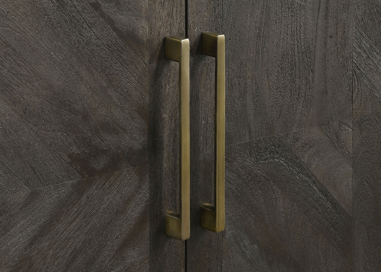 Take entertaining to the next level with the impressive style and storage presented in this contemporary server. Three doors open to reveal interiors shelving to house all manner of serve ware, linens, and other necessities. Door fronts are beautifully crafted with wood grain used to create a subtle checkerboard pattern that creates artisan flair within your living or dining room. Distinctive handles are tall and bold, adding both dimension and elegance to the server. Its top is a gorgeous slab of white marble, offering luxury and sophistication in any setting.