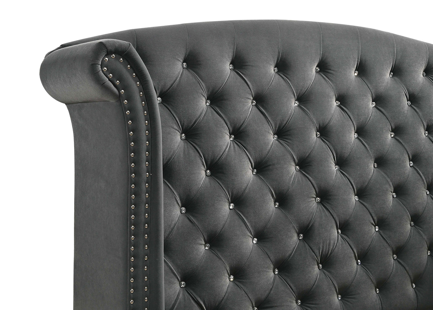 Every morning you'll wake up like you're living in a castle with this exquisite traditional style upholstered bed. An elegantly dramatic wingback style headboard makes a stunning focal point in your sleeping space. Adorned with nail head trim and button tufting, the velvet is luxuriously soft to the touch. This bed is supported on a low profile with sleek silver chrome legs. Regal and plush, this piece is the epitome of style and function.