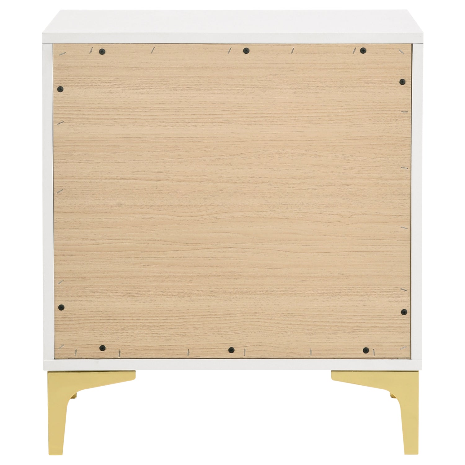 Flank your bedside with this modern glam nightstand. Designed with an elegantly understated, boxy frame, this two-drawer nightstand lends a chic, contemporary aesthetic. Clean lines and a bright, white finish elevate its sophisticated nature. Fastened to each deep drawer is a slim gold pull handle for a touch of metal. Unifying the warm metallic elements are gold bracket style legs that lend a retro look and feel.