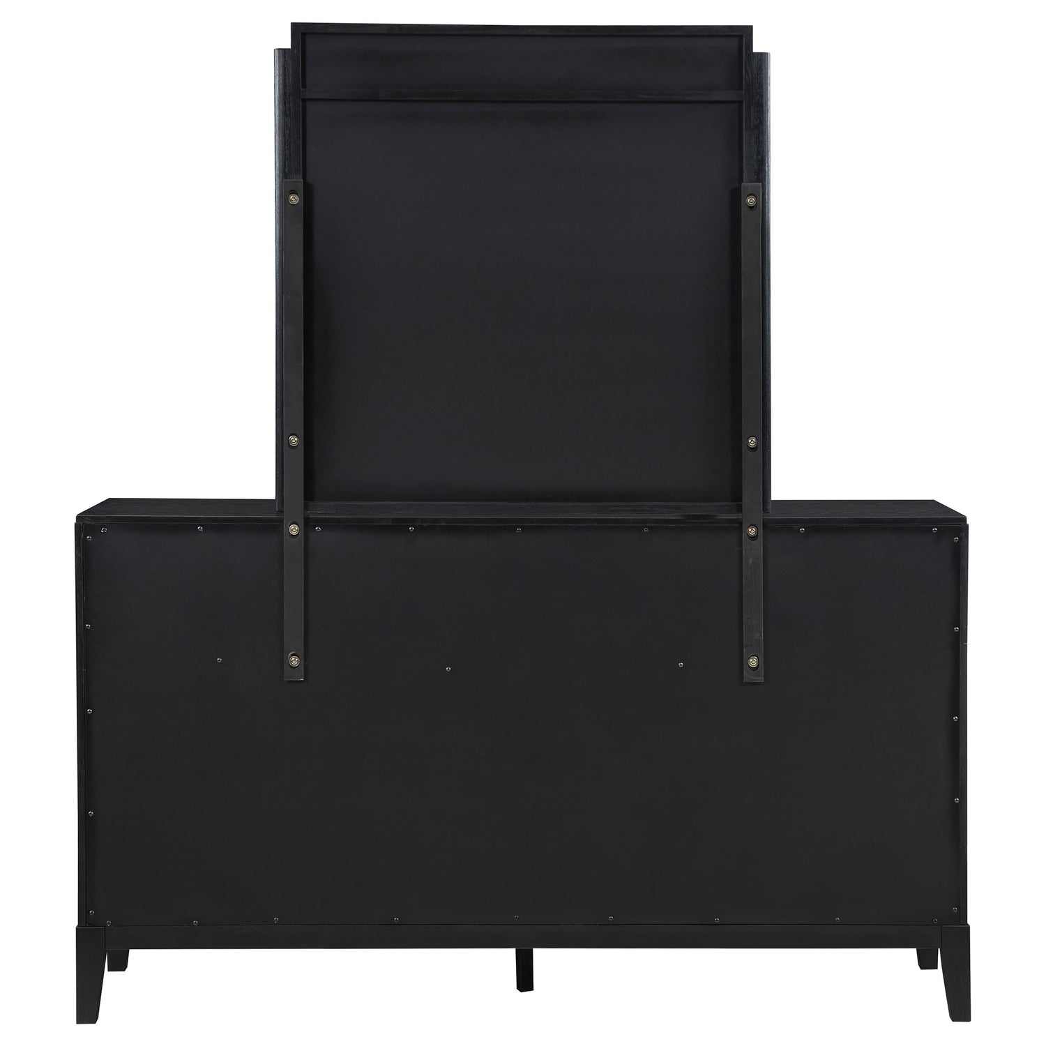 Dress up your bedroom with the impeccable texture and styling of a modern eight-drawer dresser and mirror. Vertical fluting decorates each drawer front and crowns the mirror, offering a refined, artistic touch that elevates without overwhelming. A black finish is rich and deep, perfect to blend with a variety of existing decor and furniture pieces. Its drawer fronts feature vertical fluting details and half-moon handles in a golden finish, delivering the perfect blend of contrast and texture. A framed mirror on top completes the look and offers reflectivity and depth in your bedroom.