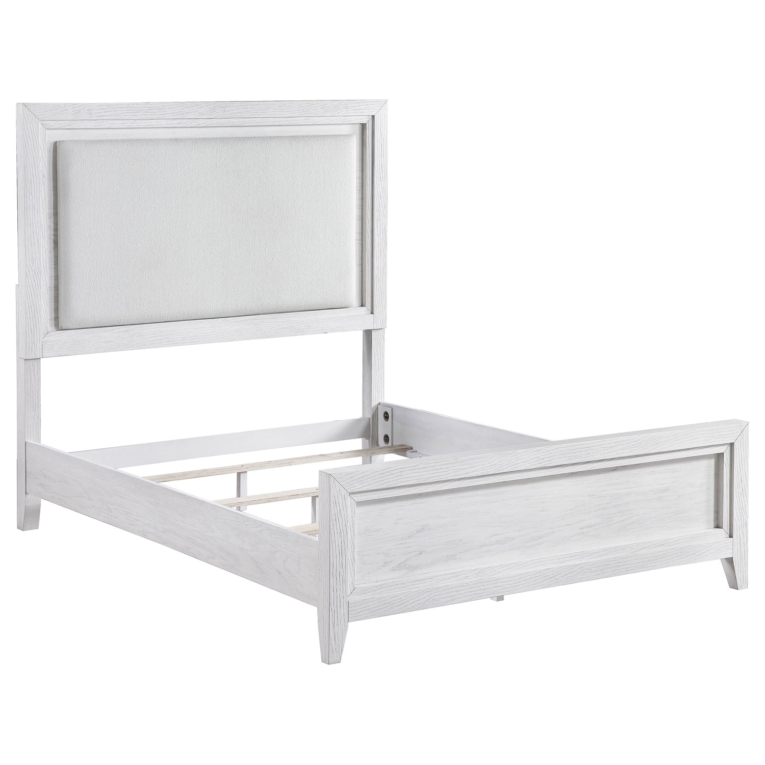 Distinctive hardware and layered trim work create a refined but dimensional effect for a five-piece modern bedroom set. In distressed white with wood grain texturing, it's a complete set that includes an upholstered bed with a padded headboard, two-drawer nightstand, five-drawer chest, and six-drawer dresser and mirror. It delivers ample storage and easy organization in a cohesive bedroom ensemble. The bed features a contemporary, open silhouette with a tall headboard and low footboard. Add colorful linens for a fresh look or stick with crisp white for a soothing monochromatic effect.