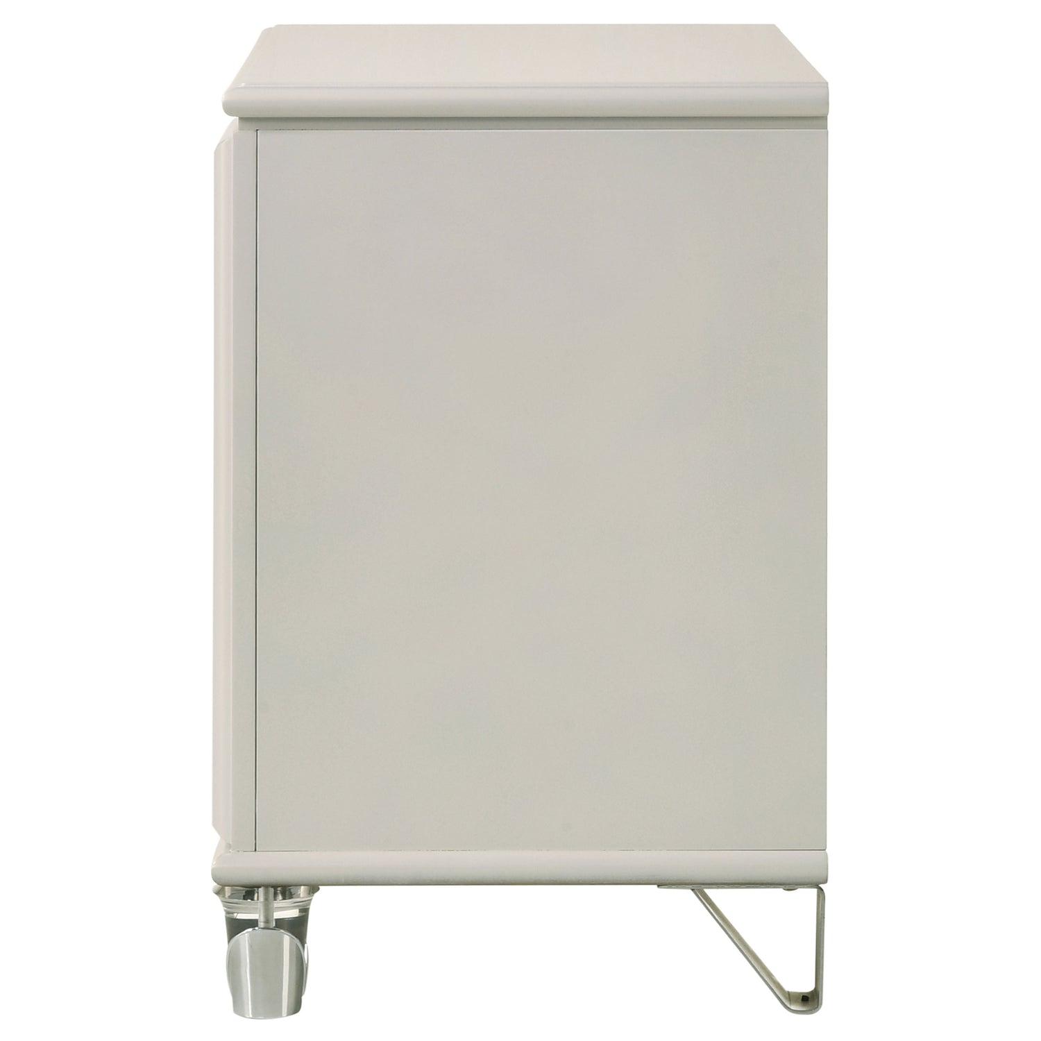 Elevate your nighttime routine with this stylish 2-drawer nightstand, a perfect blend of form and function. The pearl white finish and diamond star design on the drawer front offer a touch of glamour, while the chrome metal pulls add a sleek contrast. Featuring a top drawer with cord management access, this nightstand is designed to keep your devices neatly organized. The acrylic legs and chrome tulip-shaped caps provide a unique and elegant touch. Experience convenience and style right by your bedside.