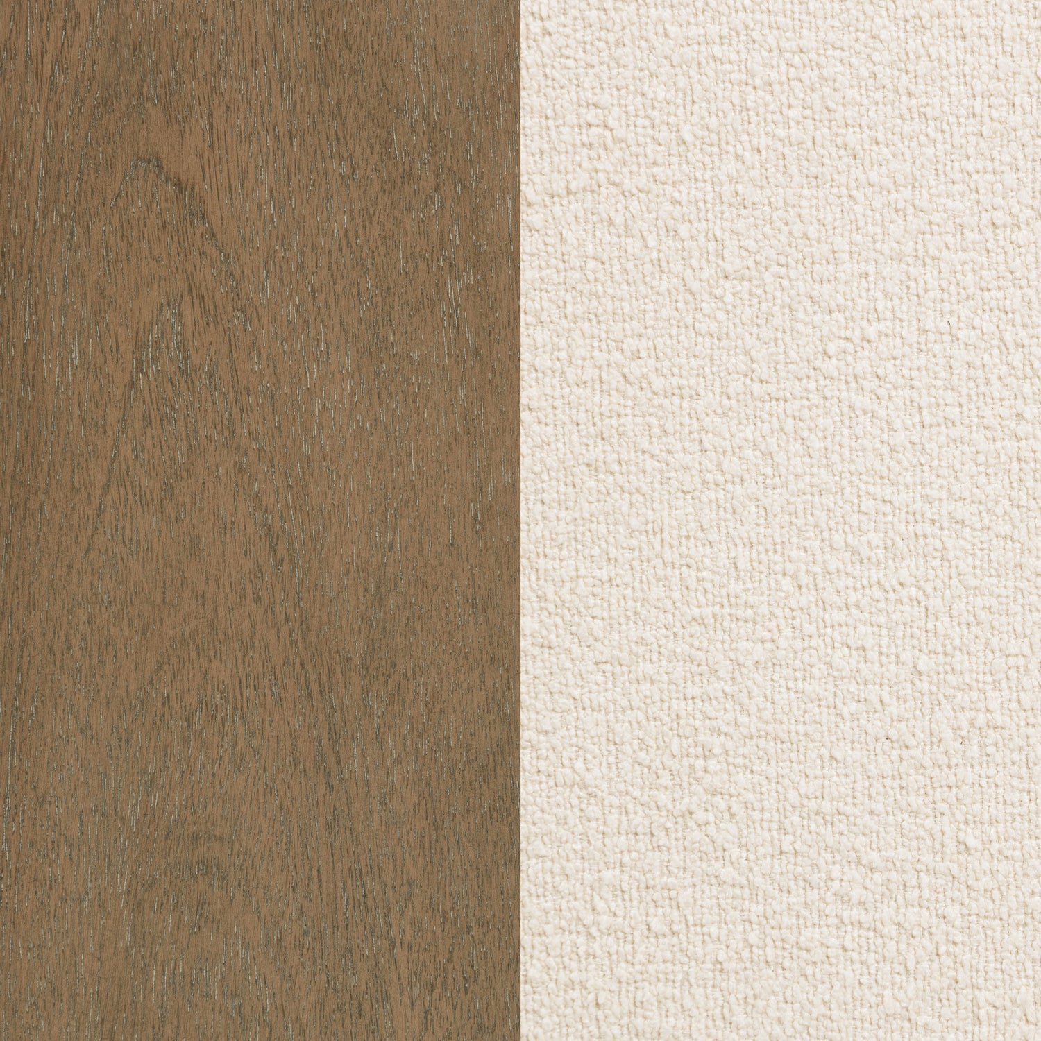 This French Provincial-inspired bed blends timeless elegance with modern craftsmanship. The arched headboard features an ecru fabric upholstered panel, framed by a gracefully curved solid poplar and engineered wood structure. A washed mango veneer finish enhances the natural grain, complementing the scalloped detailing on the footboard. Built with sturdy materials, this bed offers durability and refined style for a sophisticated bedroom setting.