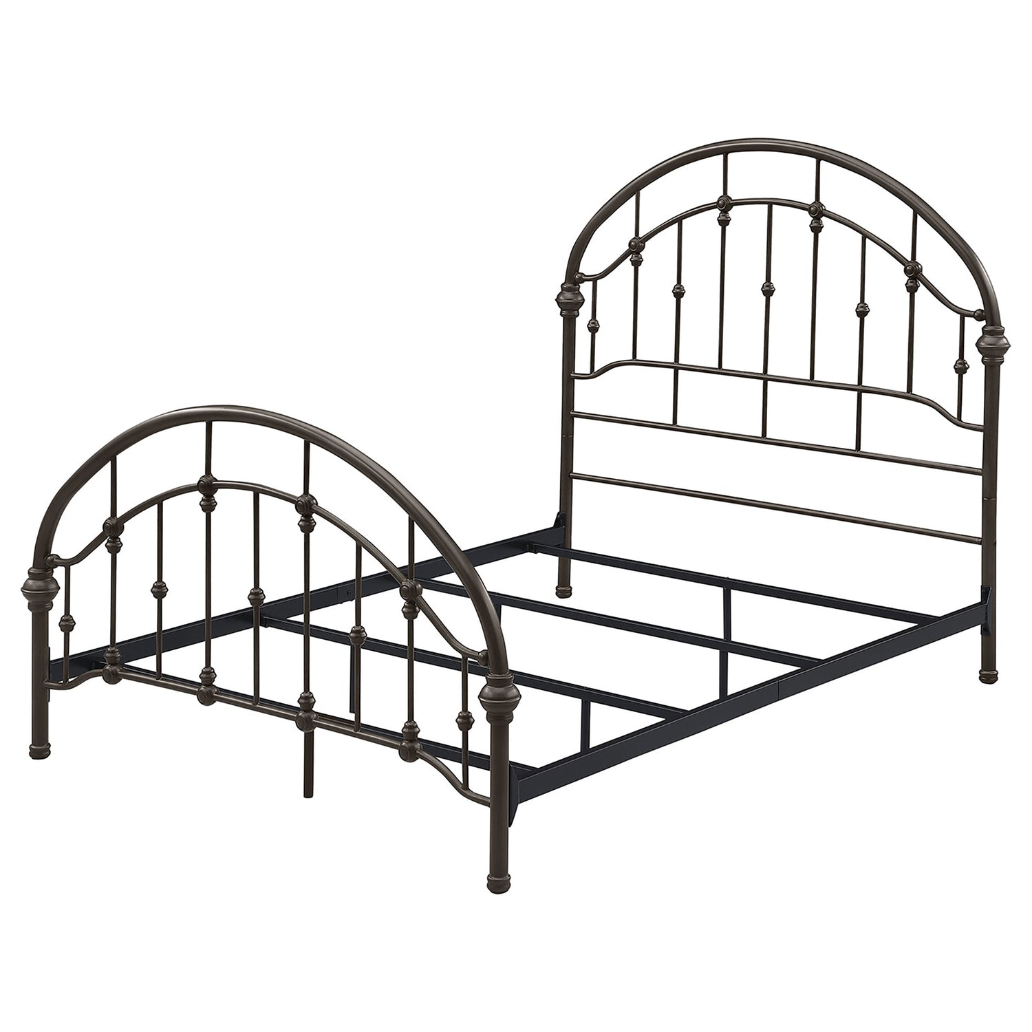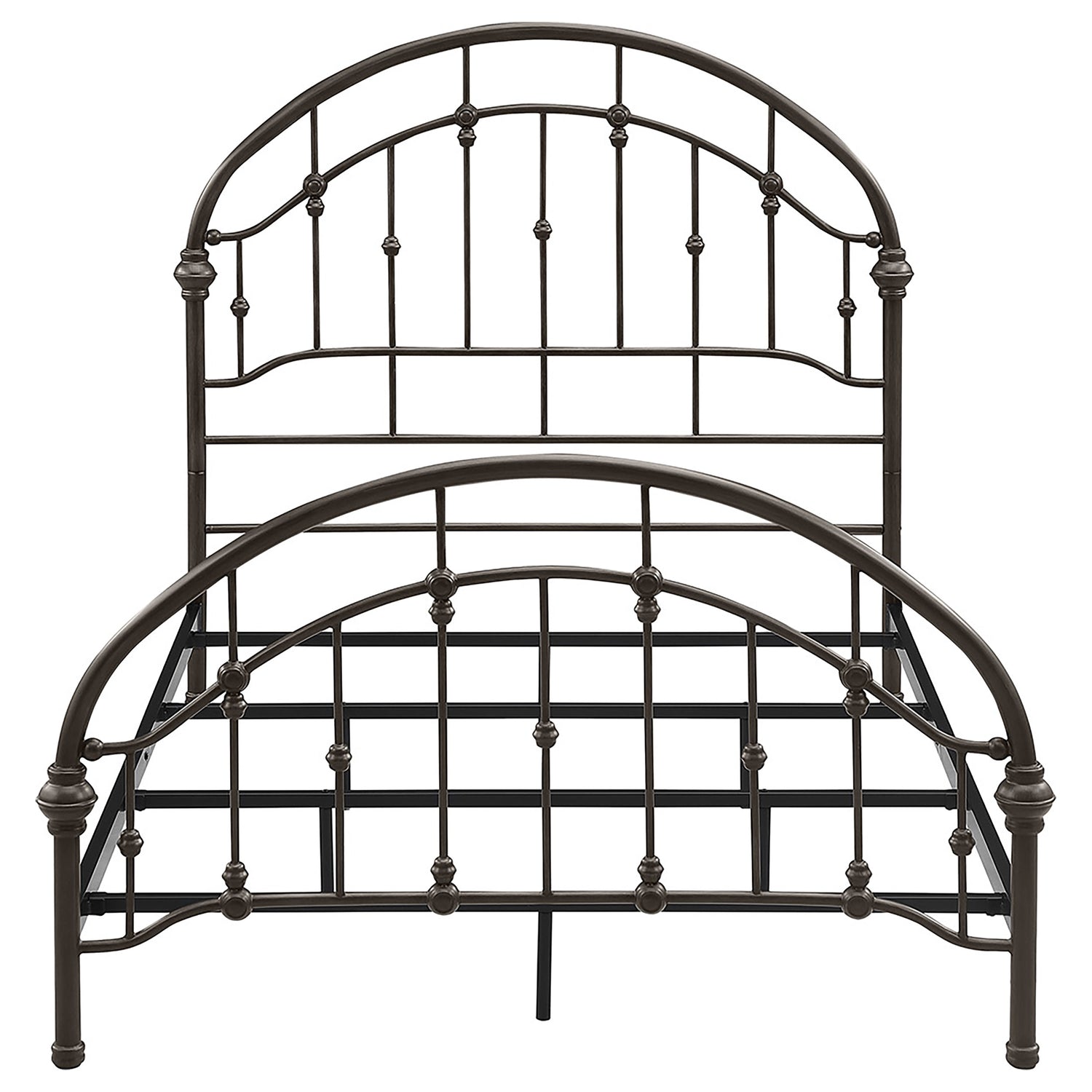 Add timeless appeal to your bedroom with this vintage-inspired metal bed frame, finished in a rich dark bronze for added sophistication. Featuring arched headboard and footboard designs with intricate detailing, this frame is crafted from heavy gauge metal for durability. Secure metal slats provide stable support for a box spring and mattress, combining elegance with functionality. Perfect for traditional or modern bedroom styles.