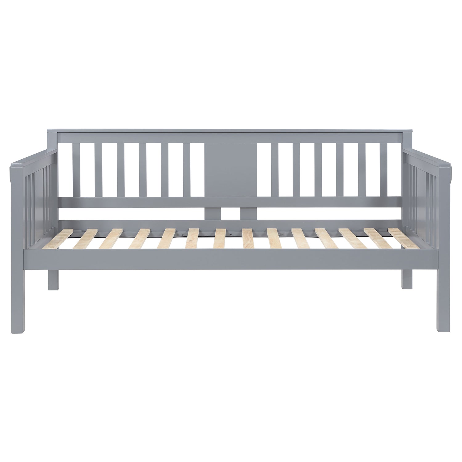 Create a spot to relax in your home office or freshen up a teen's bedroom with a contemporary wood daybed. Perfect for a casual look and feel, it features a neutral finish over pine and plywood construction, offering classic energy in an updated package. The bed features a vertical slat framework, complete with solid panel accents on three sides. Each side of the daybed includes a drop-down panel, creating a compact tabletop surface perfect for stashing essentials like your phone or a great book. A daybed offers impressive versatility, with a stylish look that works for lounging or sleep.