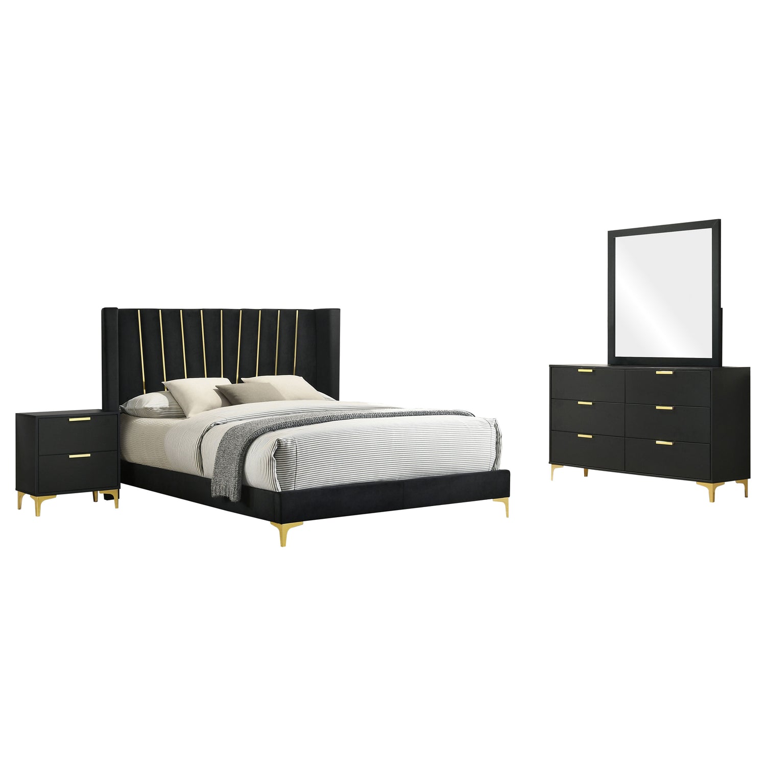 Introduce a touch of glamour to your master or guest suite with the impeccable design of a modern four-piece wingback bedroom set. Black upholstery matches a black case finish, with a nightstand and dresser with a mirror providing plenty of storage for personal items, clothing and accessories. The set centers on a sophisticated bed design, complete with a tall wingback headboard studded with golden rays that provide verticality and gleaming contrast. Matching bracket feet complete each piece, creating a bold sense of contrast and depth that anchors a glamorous bedroom setting. Add linens and lighting to create the perfect look for your space.