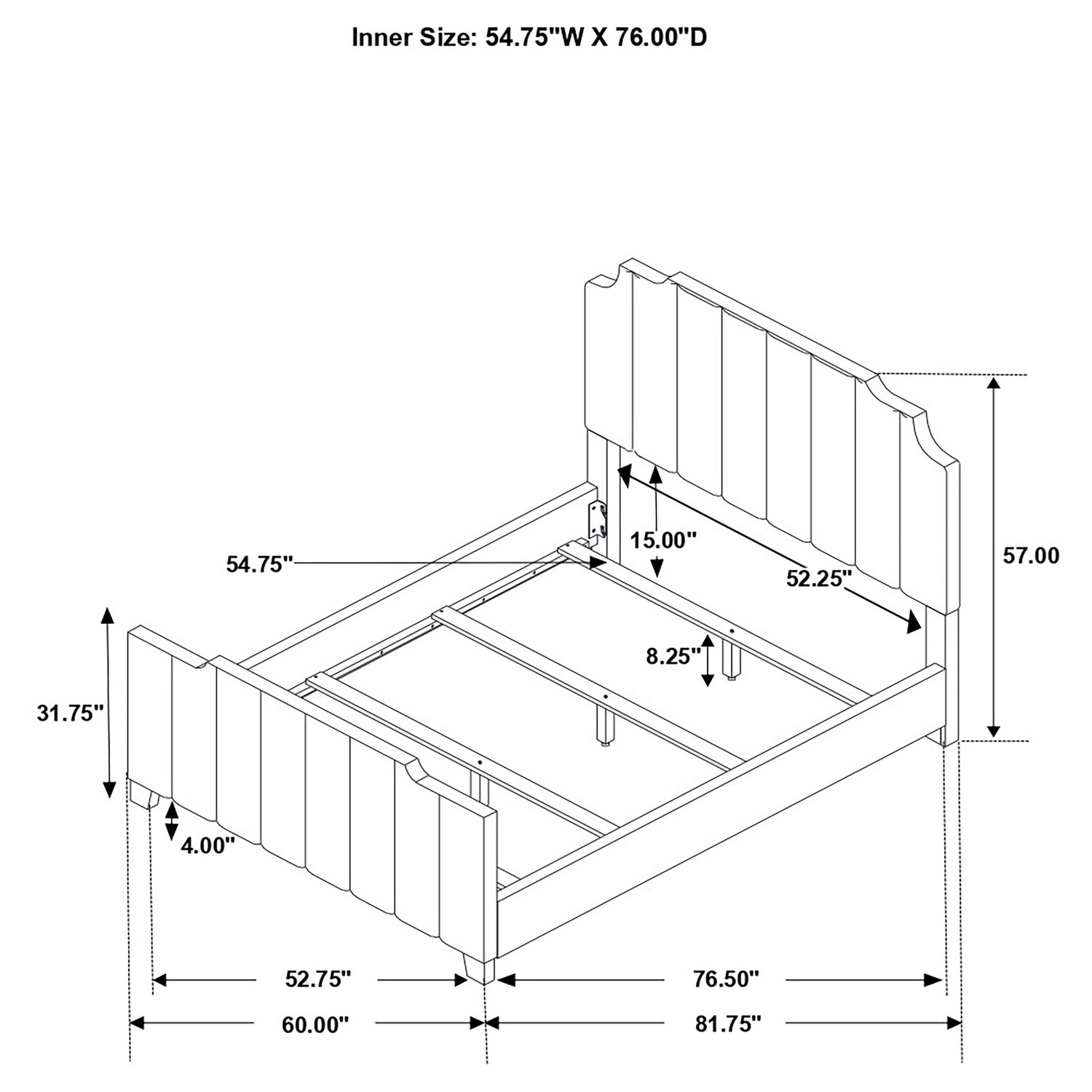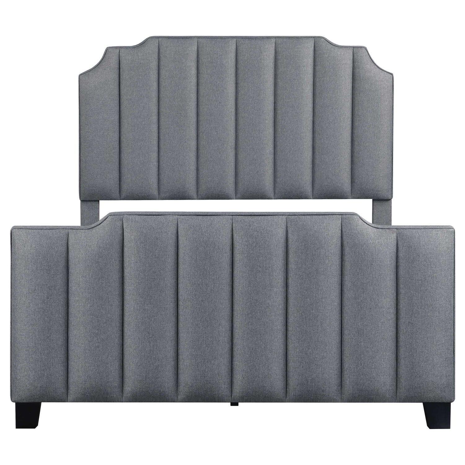 Artistry and tasteful silhouetting deliver a stunning elegance to a master or guest suite when this decadent upholstered bed becomes a focal point. A hint of Art Deco flavor shapes a vertically channeled headboard with notched edges, and a matching tall footboard, encouraging dimensionality to stand out. Wrapped in light gray upholstery, it creates a neutral yet trending palette and a design motif that lasts through the ages. This bed is constructed of pinewood and wood products. Includes black finish block feet.
