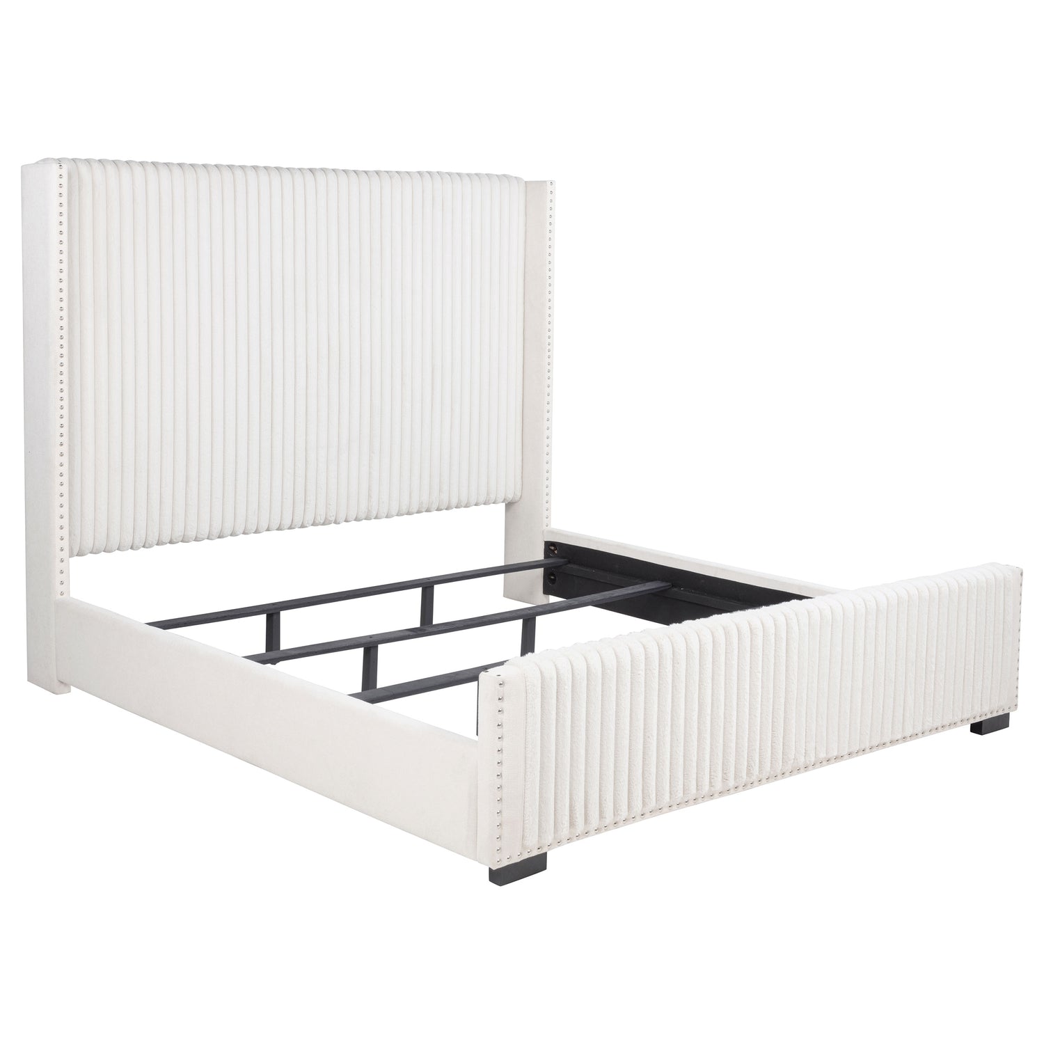 Instill luscious decadence with a modern glam upholstered bed. Cream fabric over plush foam cushioning creates a lush look and impeccable comfort when lounging. The bed is defined with its tall, wingback headboard, which boasts vertical channel tufting for the perfect hint of texture and depth. Nailhead trim traces the clean, straight lines of its silhouette, with a matching low footboard to complete the look. Choose white linens for a monochrome effect, or opt for vibrant colors to create a truly showstopping effect in your bedroom.