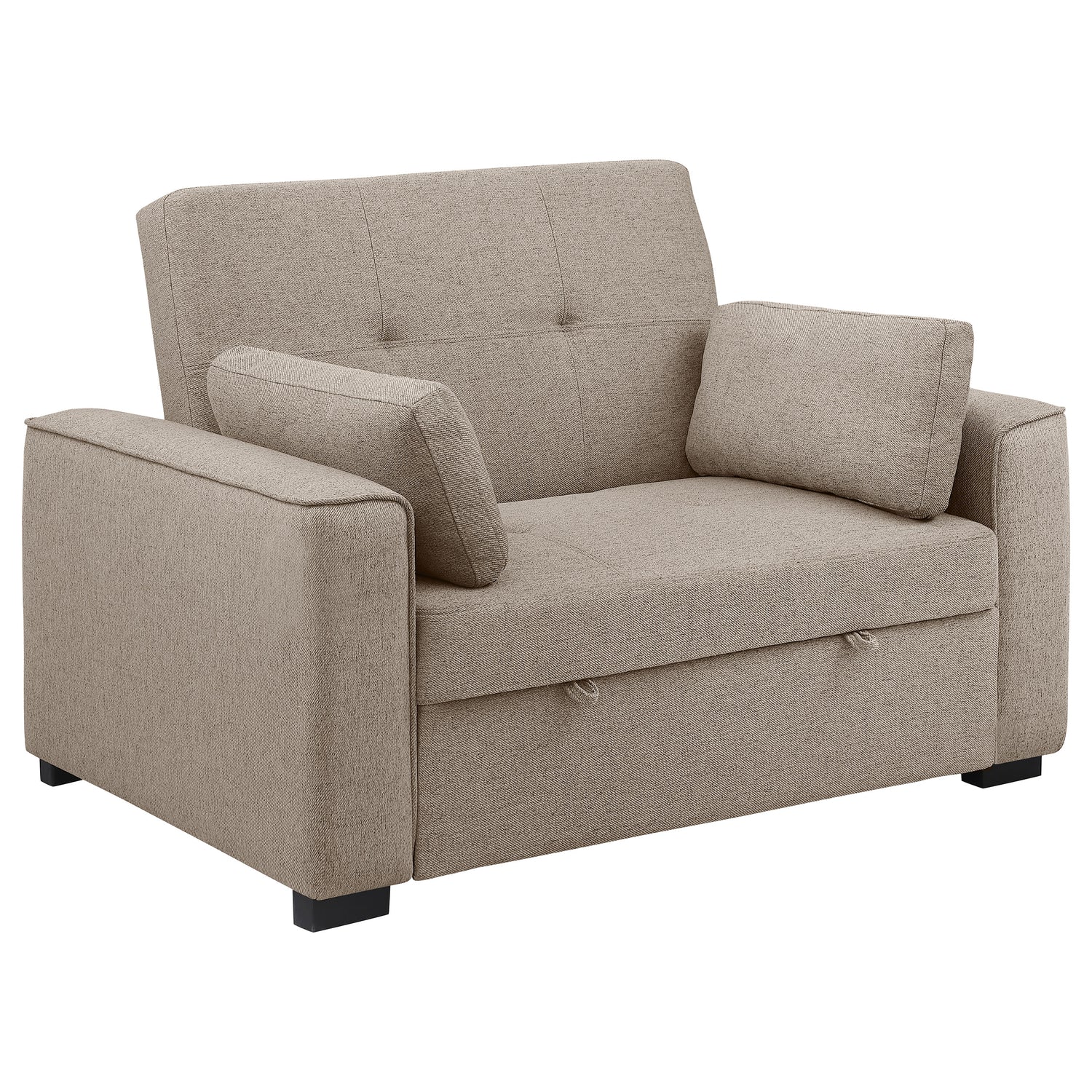 Add flexibility to your home office or living room with a modern sofa bed that doubles as a comfortable armchair. Perfect for guests or lounging, the armchair converts to a single bed, for a comfortable night's sleep. It's neutral upholstery suits in a variety of spaces, while biscuit tufting and piped trim creates a tailored look and feel. The sleeper includes two accent pillows that are ideal for relaxation no matter its configuration. Track arms adds structure and definition to clean-lined design that blends anywhere.