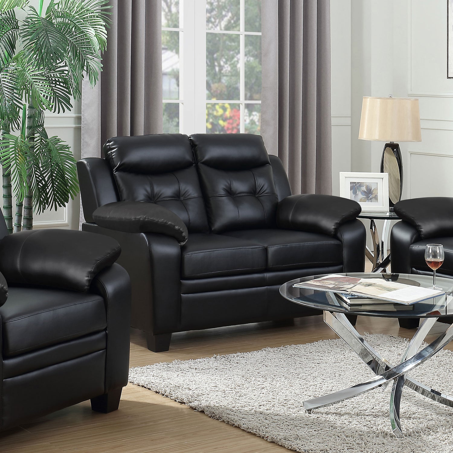 Place this stylish loveseat on its own in a smaller space, or add a matching sofa and armchair for a complete living room set. Either way, you'll be sure to enjoy its soft, soothing comfort and elegant appeal. It features smooth, leather-like upholstery with light tufting along the back. Available in multiple finishes, it pleasingly plays up any room's color motif. Sturdy, tapered legs bolster its durable frame, offering maximum support.