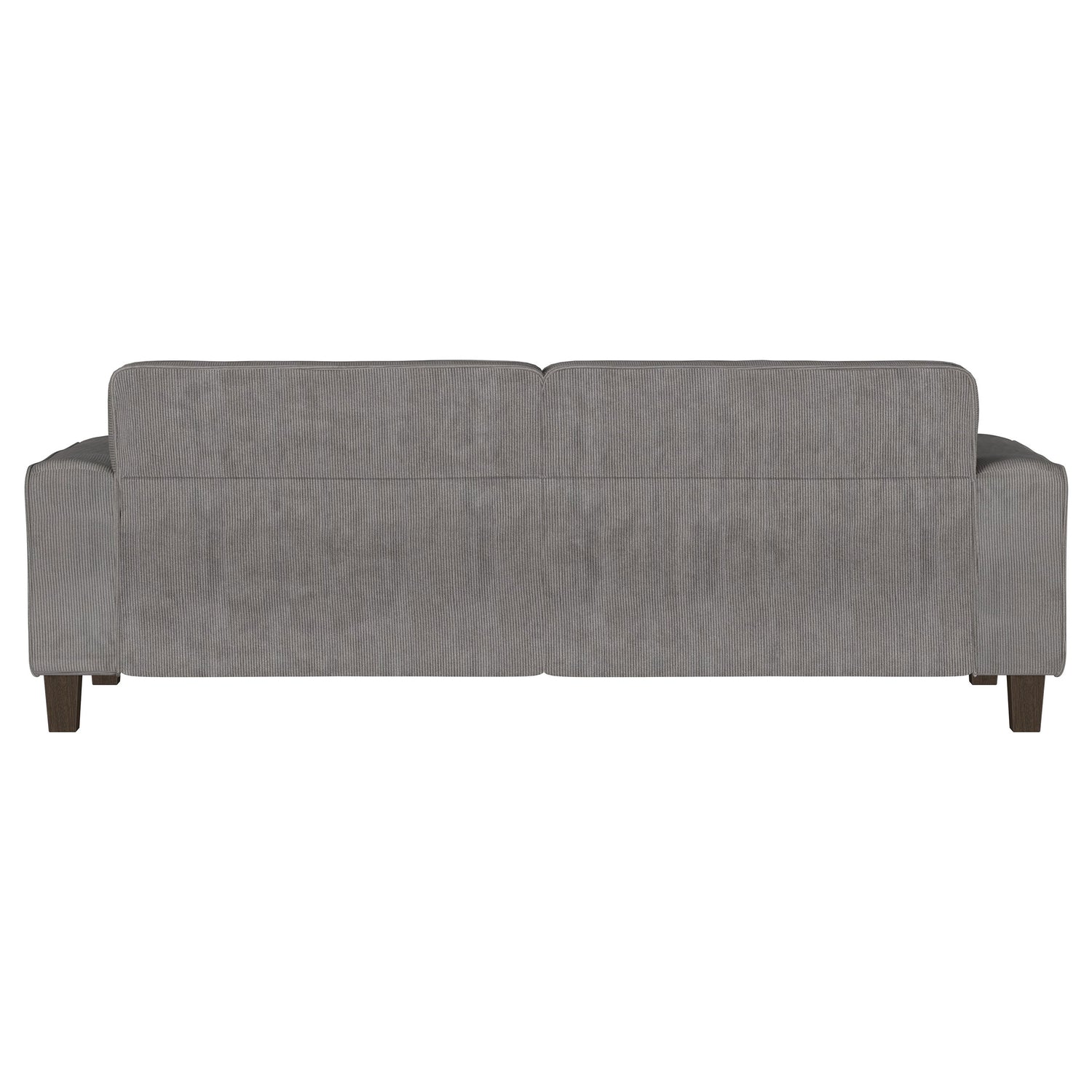 Create a stylish and infinitely comfortable and inviting living space with a modern sofa. Its timeless stance features wide track arms that pair perfectly with plush cushions for an indulgent seating experience. Great for game days, entertaining, or evenings at home, the sofa features plush upholstery with corduroy inspired texture that adds depth and dimension. Back cushions are plush and tufted, offering a grid pattern that's clean and refined. Tapering feet complete the look, offering height that creates an airy finishing touch perfect for modern living.