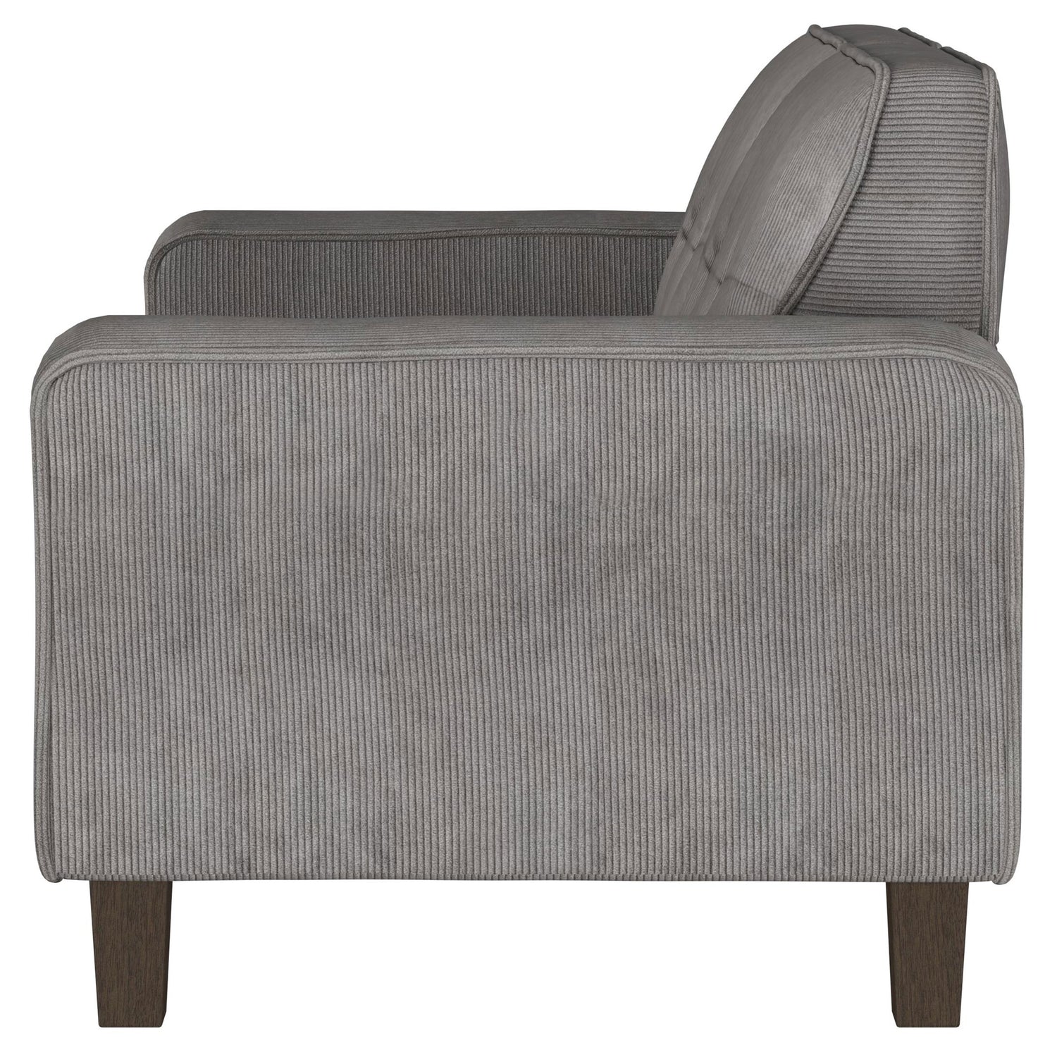 Inject impressive comfort and impeccable style with a modern loveseat in your living room or den. Its tufted back cushions add depth and dimension, perfect for a touch of character in your living area. Plush, soft upholstery in a neutral hue complements perfectly, offering inviting comfort and style with corduroy-like texture. Wide track arms add structure to a clean-lined silhouette, offering timeless flair that blends in any setting. Tapering wooden legs complete the look, offering height that create a touch of light, airy ambiance that delivers a modern design.