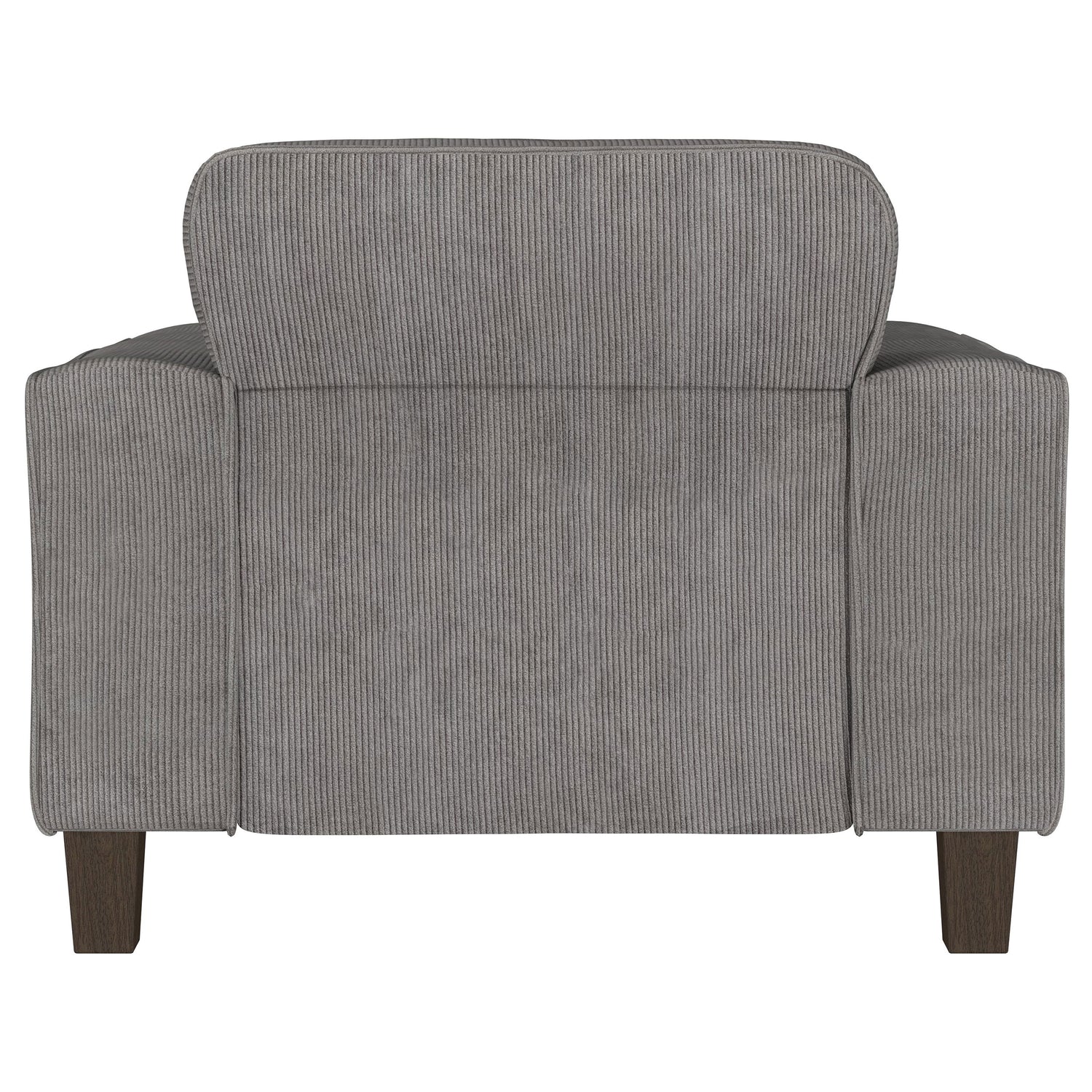 Create a lush, comfortable seating group with a modern accent armchair. Designed for indulgent comfort, it features a solid stance complete with wide track arms and plush cushions. Its soft upholstery is appealingly neutral, complementing in any setting with corduroy like texture that adds chic dimensionality. Back cushions are tufted, with a grid pattern that adds stylish character perfect for a relaxed and inviting living space. The look is complete with tall, tapering wood legs that create a touch of lift for an airy finish.