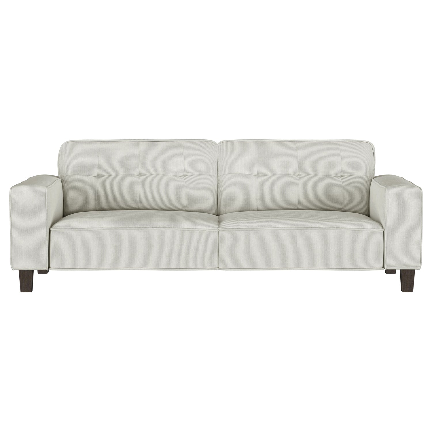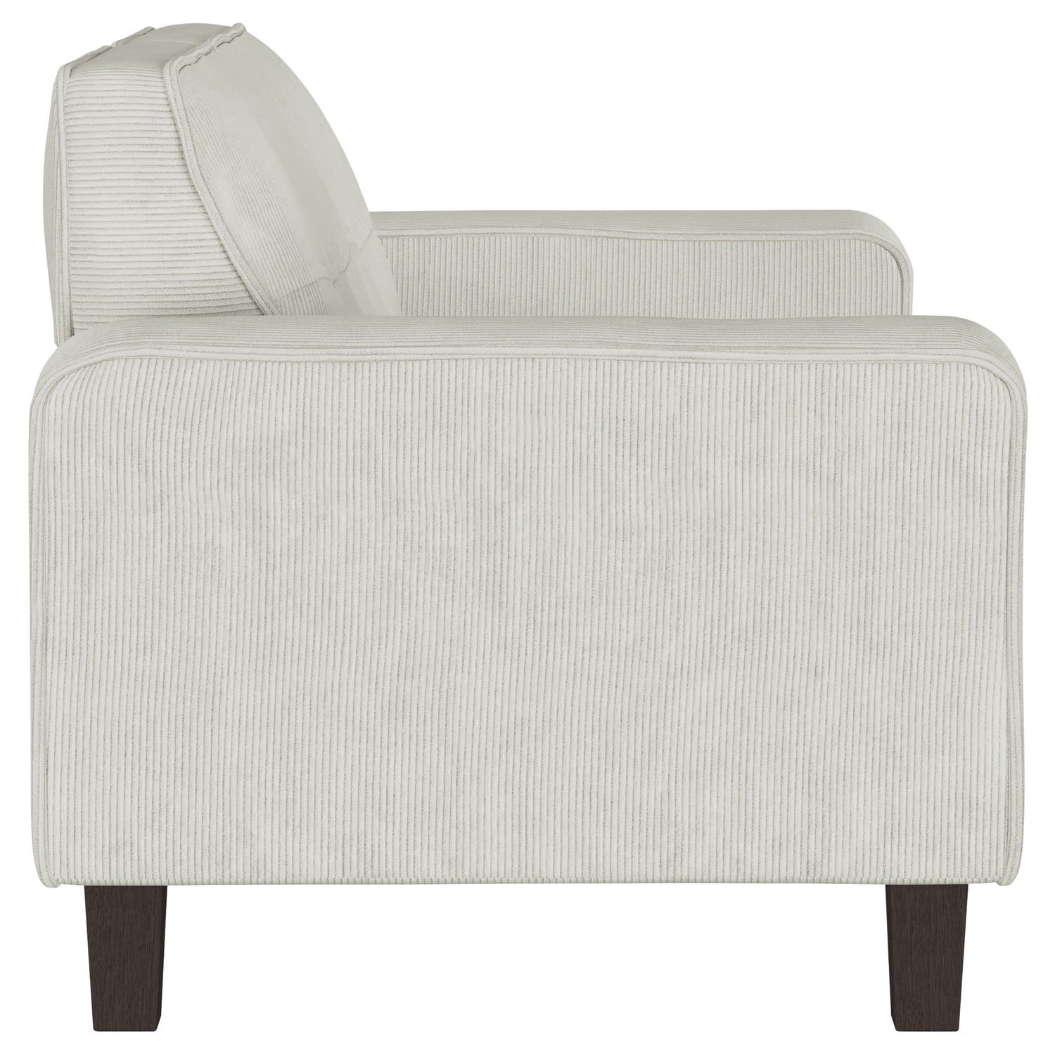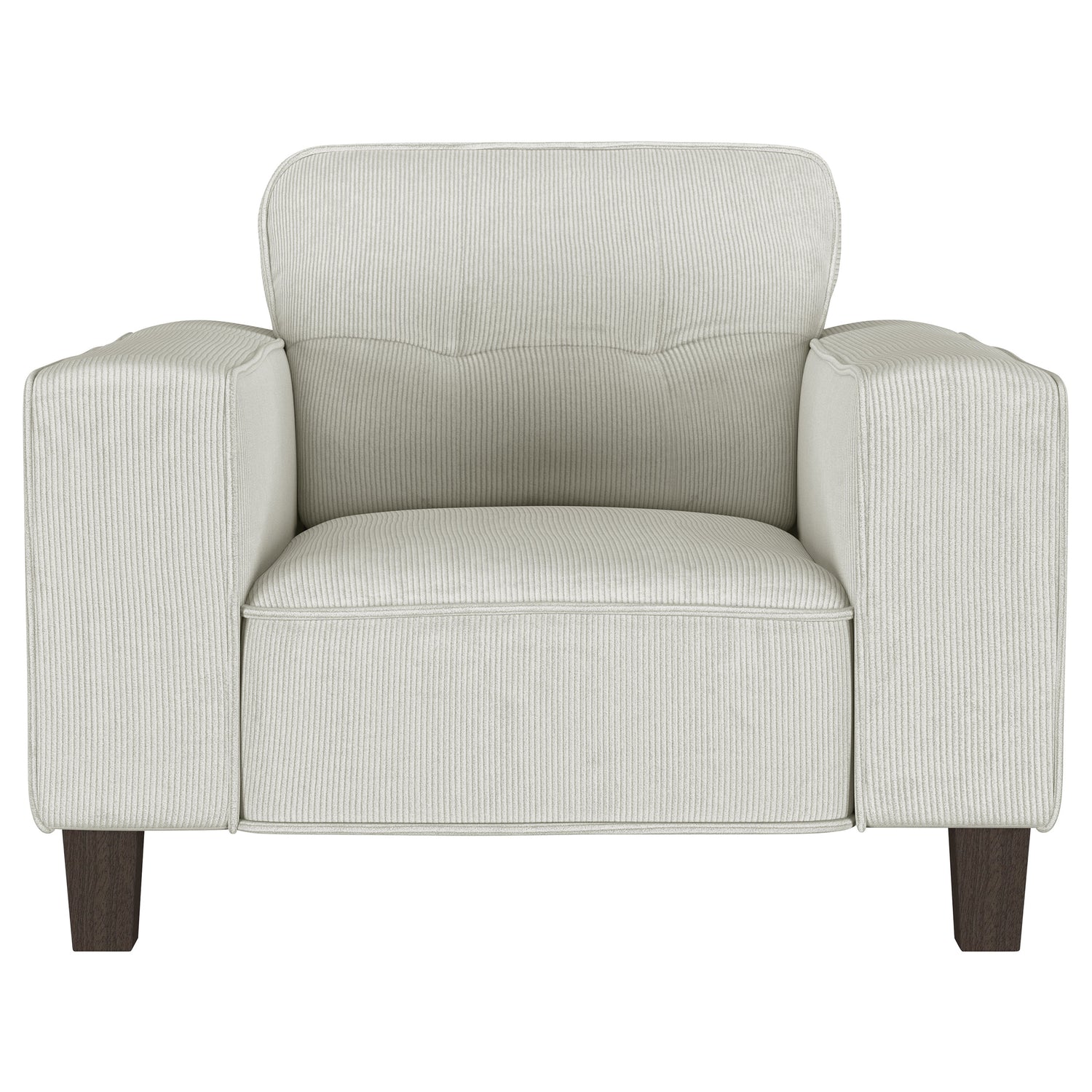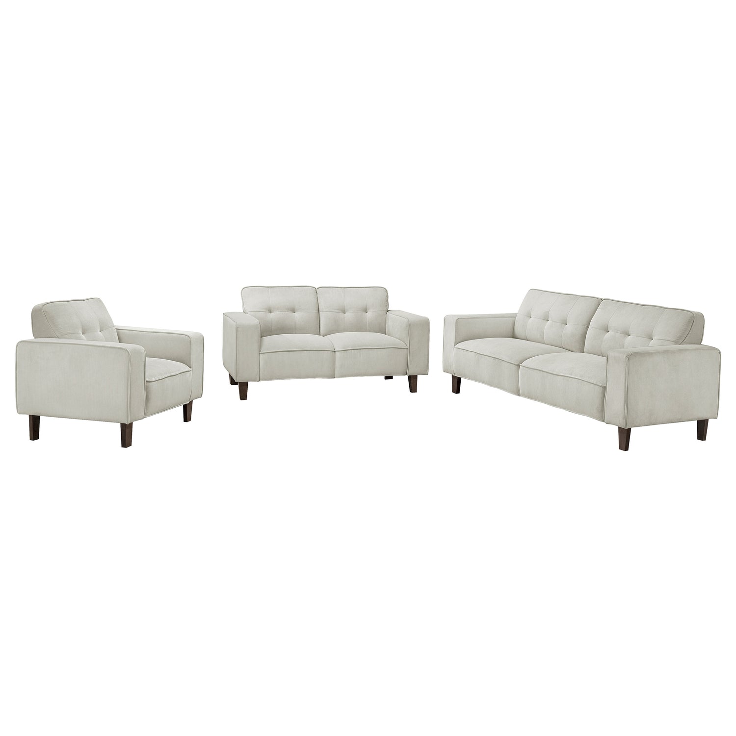 Tufted accents create the perfect dose of mid-century flair for a three-piece modern sofa set. Offering chic, comfortable seating in your living room, the set features soft, neutral upholstery over foam cushions, providing excellent comfort. A stylish silhouette is established with a wide track arms and tapered legs that provide lift for an airy touch. Seating features sinuous spring decking for wonderfully supportive relaxation. Place the sofa, loveseat and armchair together or split them amongst seating areas for a cohesive look and feel.